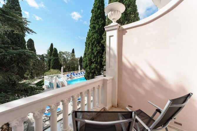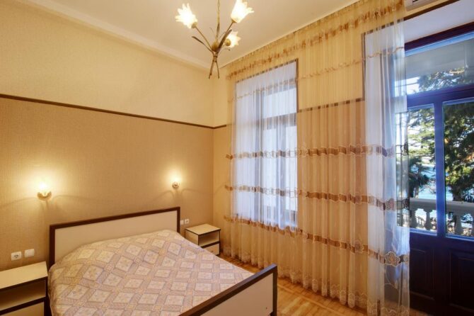 Уровень отеля – 3 звезды. Во дворе оборудован открытый бассейн с лаундж-зоной. До ближайшего пляжа – 100 метров. Здание находится на территории старинного парка. Номерной фонд состоит из двухместных стандартов и пентхаусов на 4 спальных места. Организацией питания занимается ресторан. Завтрак по системе шведского стола включен в стоимость проживания. Обед и ужин подаются по меню.