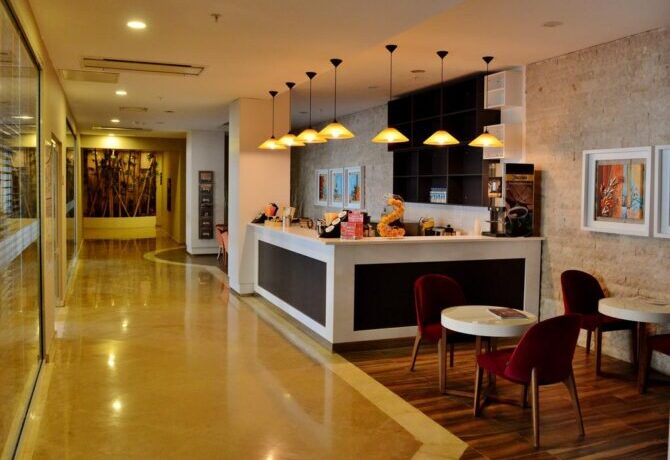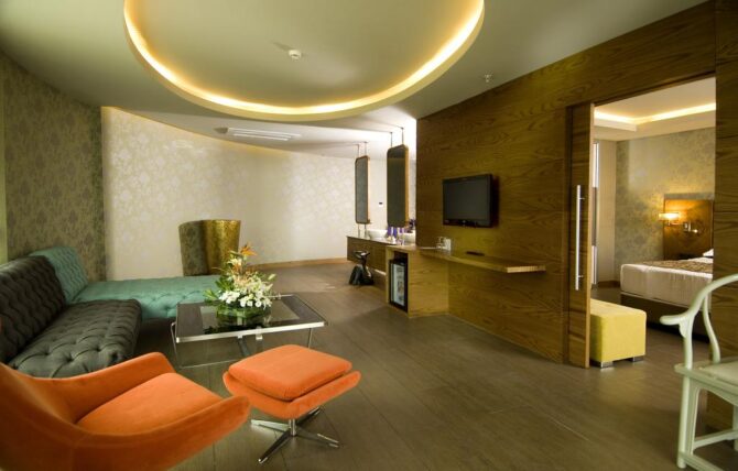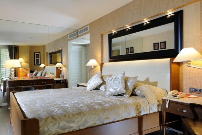 Дизайн оформлен в светлых тонах, обстановка напоминает спальни из американских фильмов. Проживающие могут смотреть телепередачи на спутниковых каналах , телефонией, климатизатором, интернетом и холодильником. Мини-бар ежедневно наполняют прохладительными напитками и турецким пивом.