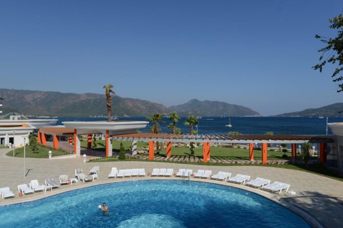 Что касается геолокации, гостиница построена, как говорилось ранее у самого побережья Средиземного моря. До международного аэропорта его отделяют 100 километров, а от центра Мармарис – 3 км. Для туристов, которые приезжают сюда на собственных автомобилях, работает парковка с круглосуточной охраной. Также вы можете взять в аренду одну из машин, имеющихся во владении администрации учреждения.
