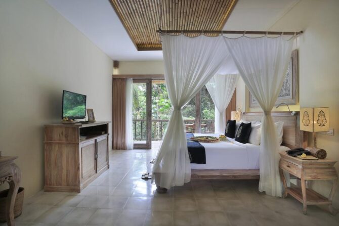 Один из самых популярных отелей в городе Убуд, расположен в часе езды от международного аэропорта и нескольких минутах пешком от центра самого города, который заслужил звание культурного и художественного района Бали. Вся территория отеля утопает в тени тропического сада, разделенного уютными дорожками и аллеями, все номера оформлены в балийском стиле, очень уютные и просторные. Из большего количества комнат есть собственный выход в сад, террасу, к бассейну. Гости могут пользоваться круглосуточным обслуживанием номеров, оснащенных спутниковым ТВ, кондиционером и интернетом на всей территории, питание также может подаваться индивидуально.