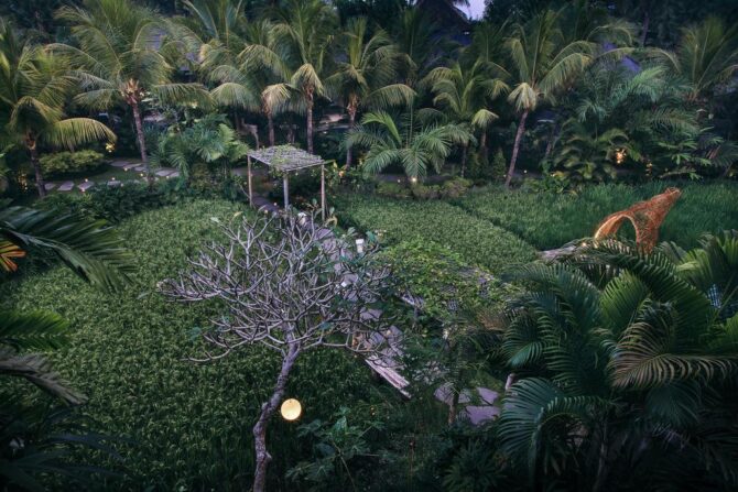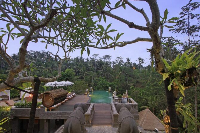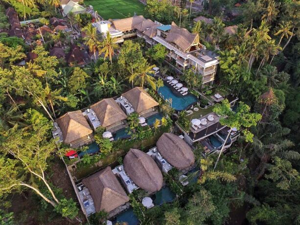 Потрясающий отель Kayon располагается в тропическом заповеднике Убуда, близ реки Петану и густых джунглей. Здесь целебный воздух, романтическая атмосфера высаженных на территории курорта садов. Основатели отеля сделали все возможное для сохранения редких видов растений и фруктовых деревьев, известных Бали и всему миру. Гости смогут добраться до аэропорта чуть более, чем за час, а до основных природных и исторических достопримечательностей совсем недалеко — 15 минут. Вся территория курорта гармонично вписана в природный ландшафт и уникальна в авторской архитектуре. Виллы украшены богатой резьбой по дереву и камню, роскошные номера оснащены мебелью в национальном стиле из натуральных материалов. К услугам гостей — несколько вилл де люкс с выходом в сад, к бассейну и в окружающие джунгли, а также размещение на берегу реки.