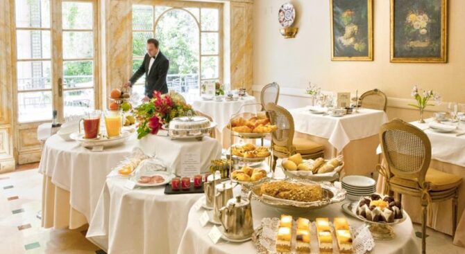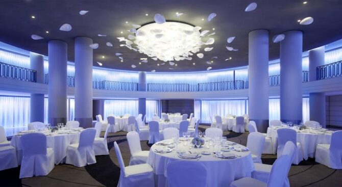 Относится он к заведениям премиум класса, его самая популярная часть – это крыша в виде витражного купола, под ней гостей встречает завтрак в виде шведского стола, живым музыкальным сопровождением, еще здесь находится бар с множеством коктейлей и всевозможных напитков.
