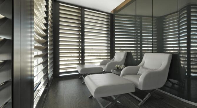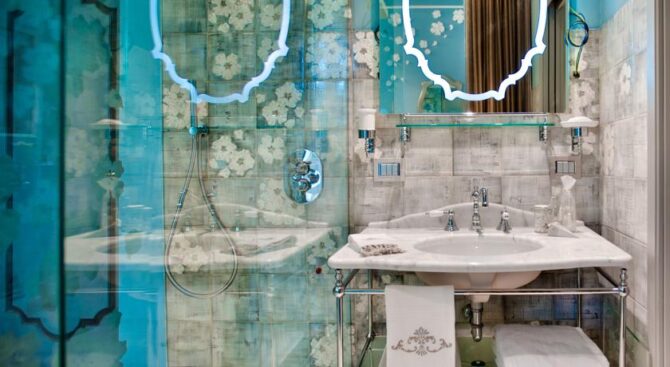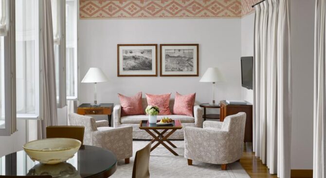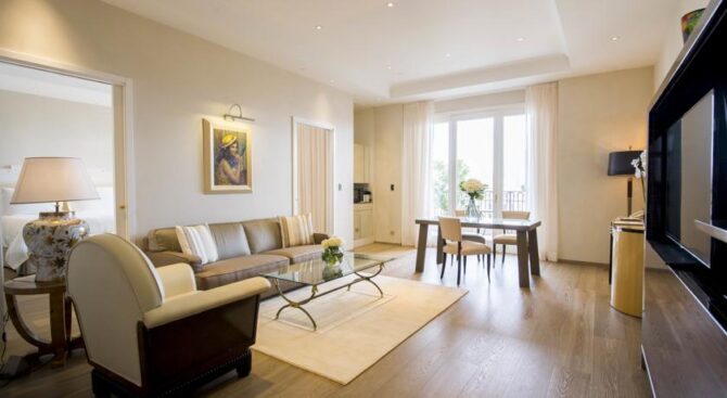 Интерьер всех номеров сочетает в себе лаконичность современного стиля с элементами элегантной классики. Комнаты украшены лепниной ручной работы, ванные отделаны мрамором.