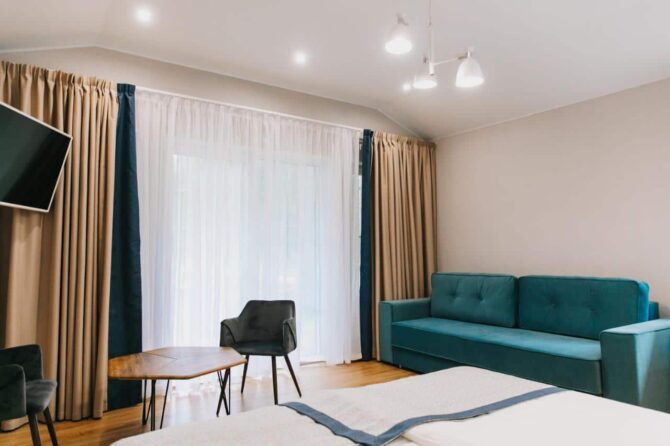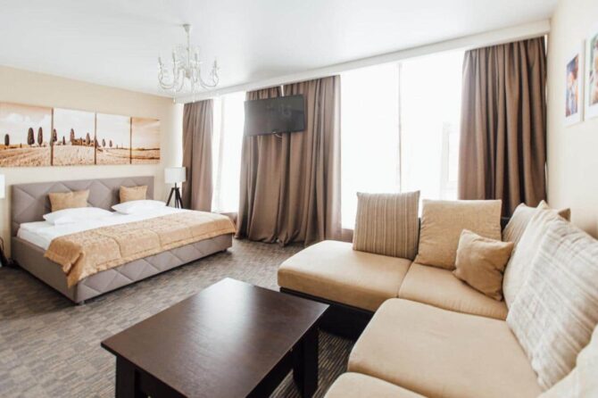 Если нет желания уезжать далеко от города, то в самом центре можно поселиться в 4-звездочном гостиничном комплексе «Азимут». Отели сети Azimut предоставляют комфортные условия проживания и полных спектр фирменных услуг. Утром в ресторане «Романовский» «2-й этаж) накрывается завтрак. Затем гостей принимает ресторан «Цветной бульвар», расположенный на 1-м этаже. В его просторном Атриуме пройдут проводы уходящего года. Праздничный ужин продлится до 23.00. В меню предусмотрены мясная, рыбная, сырная и фруктовая тарелки, овощное ассорти, 4 традиционных салата с фирменными соусами, шашлыки, горячие блюда на выбор, торты и пирожные. Спиртное не входит в стоимость столика. Гостям разрешается приносить его с собой. В шоу-программе примут участие артисты «Кабаре «Юта», кавер-вокалисты, ведущая. Затем начнется дискотека с конкурсами, перерывом для встречи Нового года и фейерверка. Так как отель находится в самом центре города, гости могут уйти после ужина и прогуляться к открытой сцене на площади. На ней состоится главное новогоднее представление и праздничный салют. 1 января гостей будут ждать на поздний завтрак вплоть до 13.00. В парках и улицах вновь начнутся праздничные гуляния. Вечером можно расслабиться и отдохнуть в инфракрасной сауне и искупаться в бассейне.