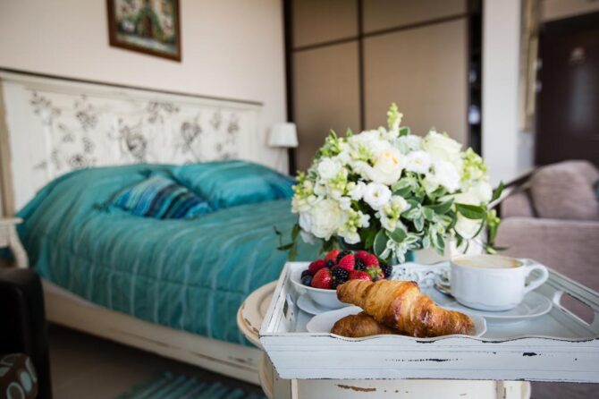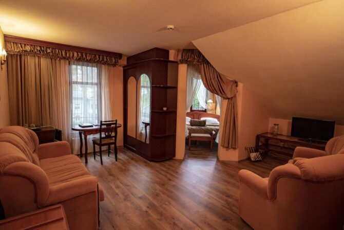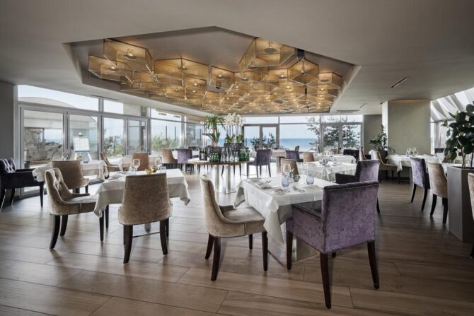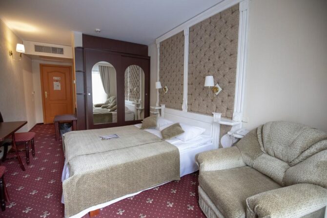 Главным преимуществом Европы – 4-звездочной гостиницы, состоящей из двух неравных по вместимости и комфорту корпусов – считается расположение на одной из центральных улиц, идущих параллельно побережью. Прежде всего, она привлекает курортников, предпочитающих нешумные и малолюдные районы. Именно это они находят в той части города, где среди высоких деревьев скрывается Европа. Как следствие, для них вполне естественно поселиться в одном из 40 скромно обставленных номеров или выбрать что-то из 7 шикарных апартаментов. Бюджетный вариант суточного проживания здесь доступен практически любому гостю города, не заботящемуся о комфорте. Для этого будет достаточно 60-90 €. Более серьезные расходы – до 250 € — ждут тех, кто рассчитывает на роскошные апартаменты. Все покои основного корпуса и залы ресторана, спа-комплекса, бизнес-центра и бара отличаются небольшими размерами.