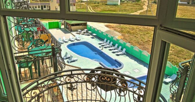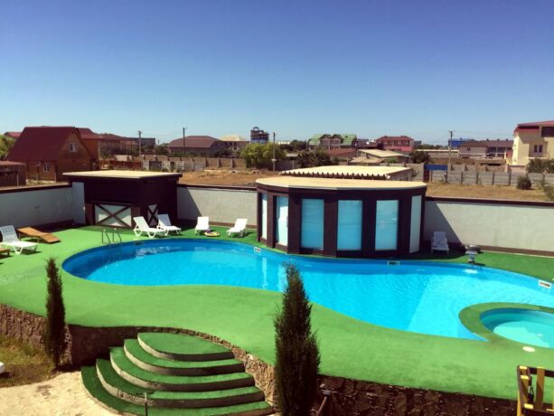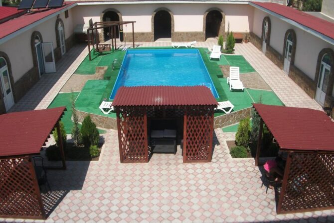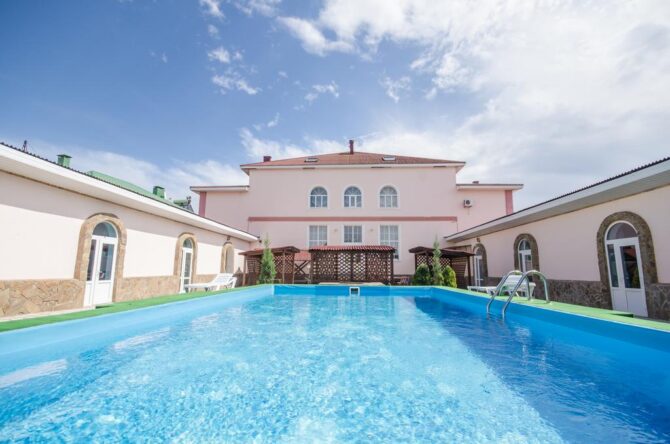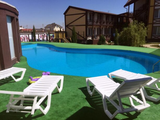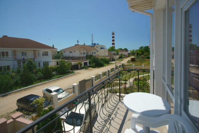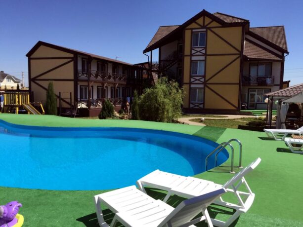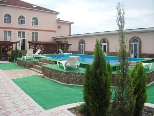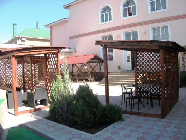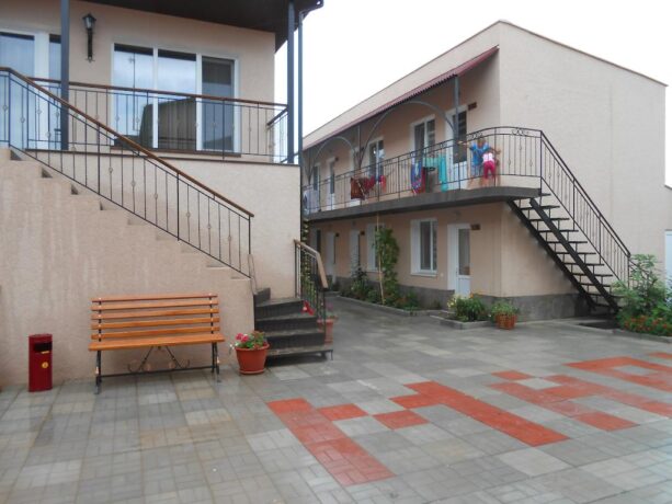 Гостевой дом с небольшим двором расположен в полукилометре от моря. В номерах установлены кондиционеры, в некоторых имеются просторные балконы. На территории установлен небольшой бассейн, предназначенный в основном для детского купания. Рядом оборудована небольшая зона отдыха с шезлонгами для родителей. В 70-ти метрах от отеля находится оздоровительный центр «Маяк». Это большой санаторий федерального значения, в который можно приобрести курсовку для прохождения лечебных процедур. Также рядом с отелем находится автобусная остановка, на которой останавливается транспорт, идущий в Евпаторию (каждые 10-15 минут).