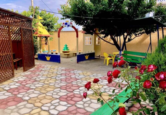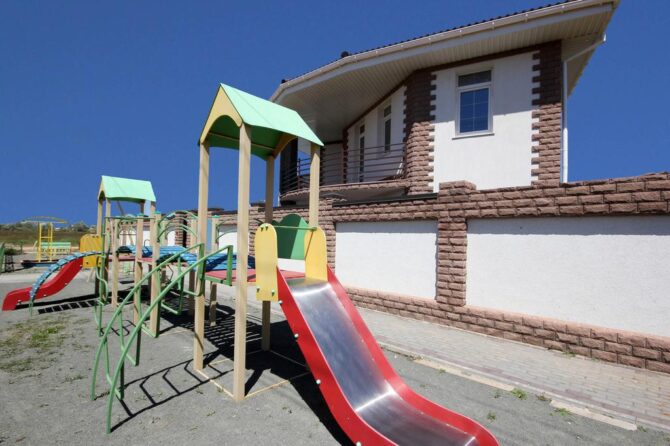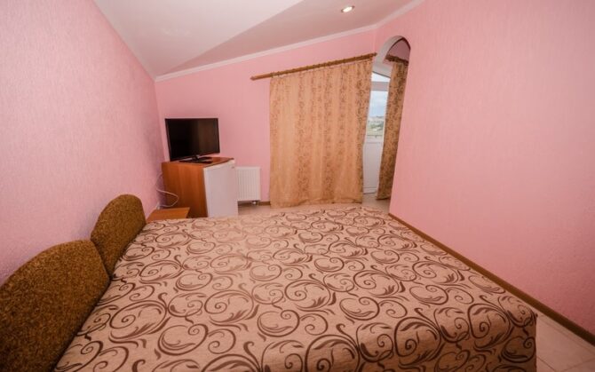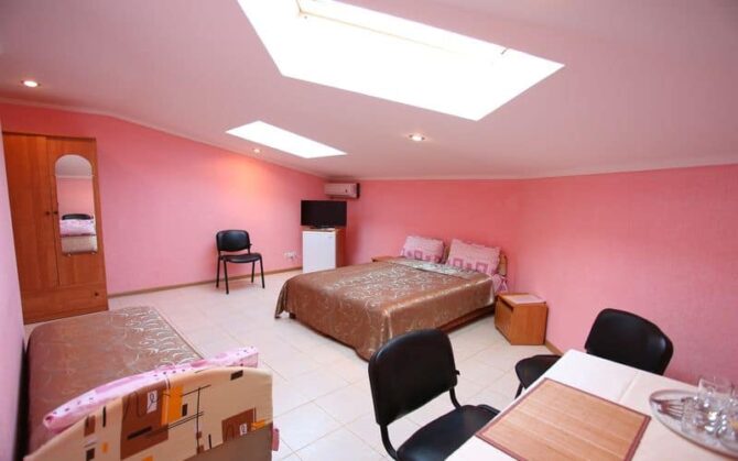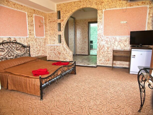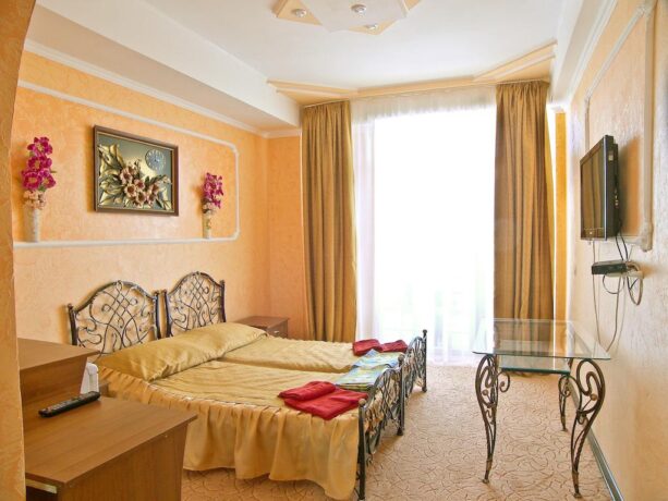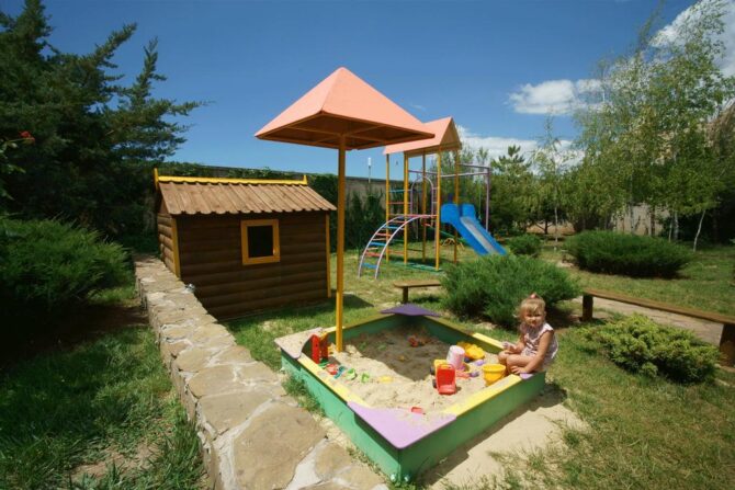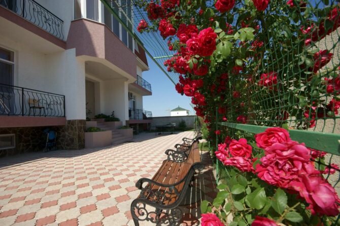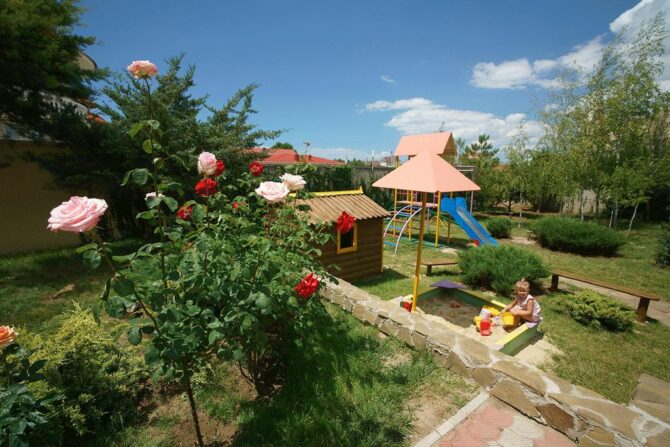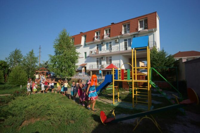 Придомовая территория гостиницы очень небольшая, но на ней поместились беседки с мангалами, детская площадка. Двор очень ухоженный, посажены розы, дорожки выложены цветной плиткой, много зелени. В жилом корпусе три этажа с цоколем и мансардой. В фонде – 15 номеров, среди которых имеются семейные Стандарты и Люксы. В гости к детям приходят аниматоры, по вечерам в холле показывают мультфильмы на большом экране. Предоставляется комплексное питание за дополнительную плату. До ближайшего пляжа – 400 метров.