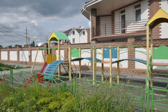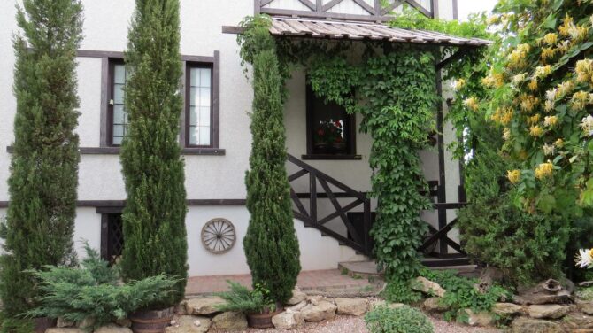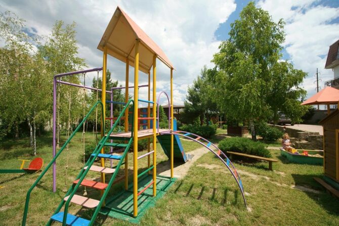 На первый взгляд здание и двор мини-отеля напоминает хороший детский сад. Много зелени и красок, яркий уличный игровой уголок, зелень, цветы и милые декоративные украшения создают атмосферу домашнего уюта и беззаботного детства. На территории отеля есть бассейн, баня с купелью, летняя веранда, прокат велосипедов. Особое внимание владельцы уделяют питанию гостей. Оно предоставляется за дополнительную оплату. Утром подаются румяные блинчики с омлетом и кашкой, комплексного обеда хватает надолго, а вечером здесь угощают блюдами, приготовленными на гриле. По выходным к детям приходят аниматоры, а взрослых развлекают музыканты.