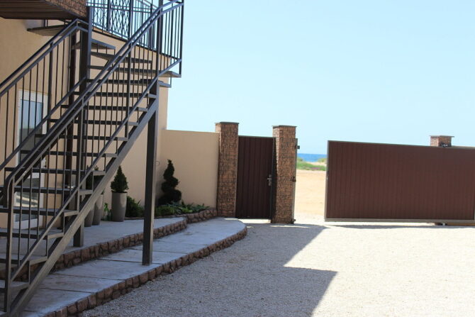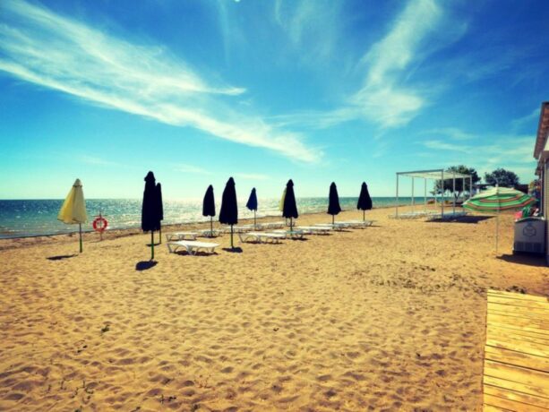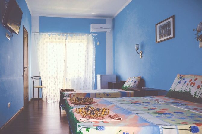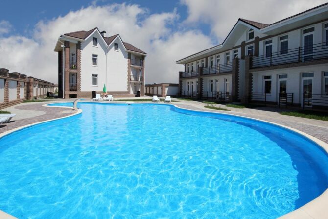 Если хочется жить поближе к морю, то гостиница «Уют» — это один из вариантов. Корпус расположен на закрытой охраняемой территории в 50 метрах от пляжа. Все номера с балконами, двор ухоженный, выложен плиткой. Обустроена детская игровая площадка с песочницей. Есть место, где пожарить шашлыки. Парковка находится за забором, но попадает в видимость видеокамер. На пляже установлены водные горки, батуты, предлагаются разные виды развлечений. Питание предоставляется, но постояльцы могут выбрать кафе по своему вкусу. В номерах имеется холодильник, посуда, можно взять чайник у администратора.