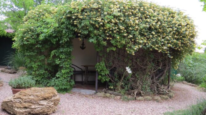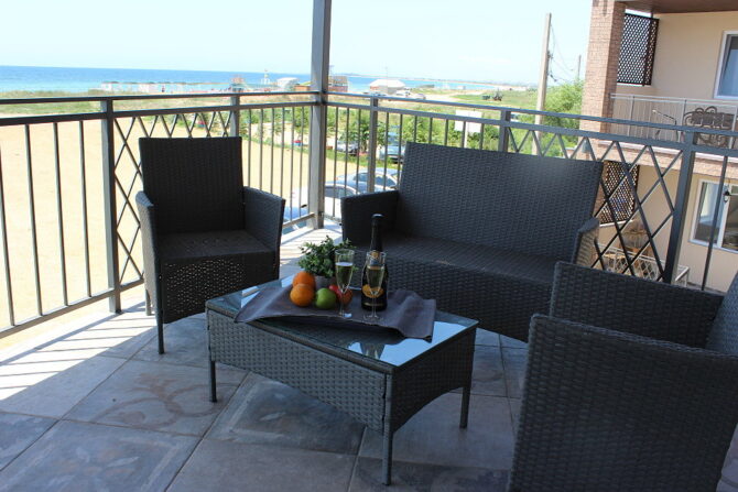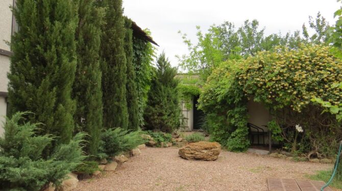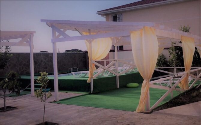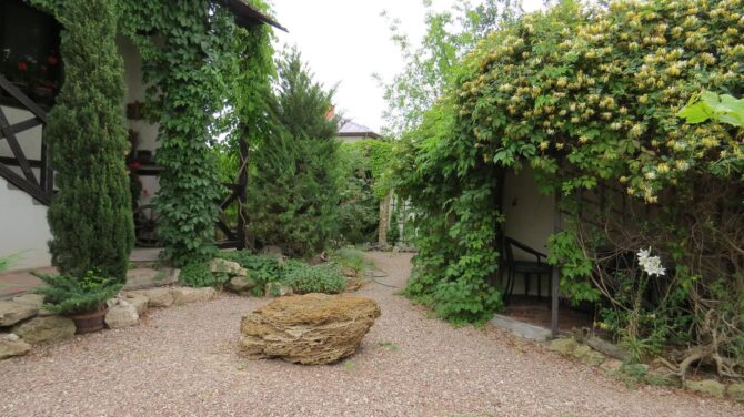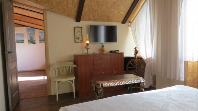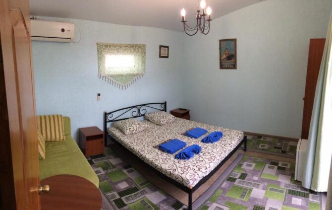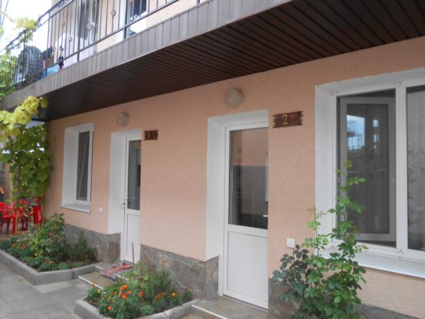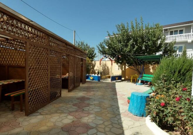 Мини-отель находится в 10 минутах ходьбы от моря. Это тихое уютное место на территории садового кооператива. К номерам второго этаже ведет уличная лестница на общий балкон. Внутри корпусов имеются общие кухни, садовая мебель для чаепития на улице. Для игр детей предусмотрена площадка с горкой и песочницей. Питание предоставляется, но не входит в оплату проживания. Предлагаются комплексный завтрак, обед и ужин на выбор по меню. Владелец готов обеспечить трансфер от/до ж/д вокзала Евпатории и аэропорта Симферополя.