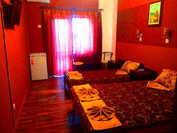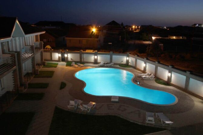 Гостиничный комплекс находится в частном секторе в полутора километрах от ближайшего пляжа. Такая удаленность диктует свои правила, касающиеся в том числе и ценовой политики. Чем дальше от моря, тем дешевле, но не значит, что хуже. Обычно отели такого уровня предлагают не очень хорошие условия проживания. Вега приятно удивит просторными номерами, наличием бассейна, большими балконами с мебелью, ухоженной территорией. Установка дополнительного места доступна в любой комнате. Питание предоставляется, но не входит в стоимость номера.