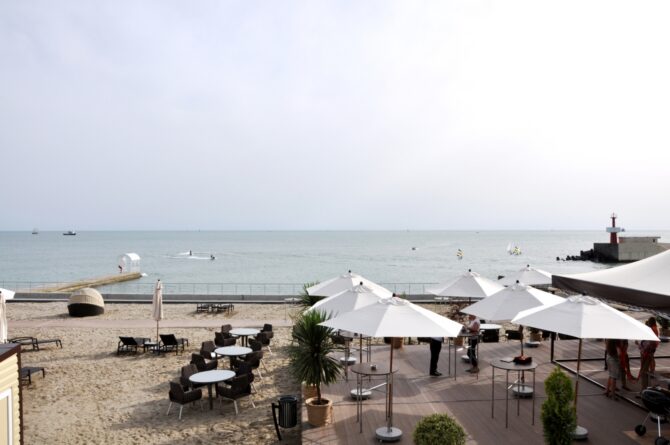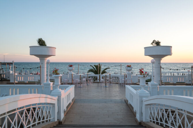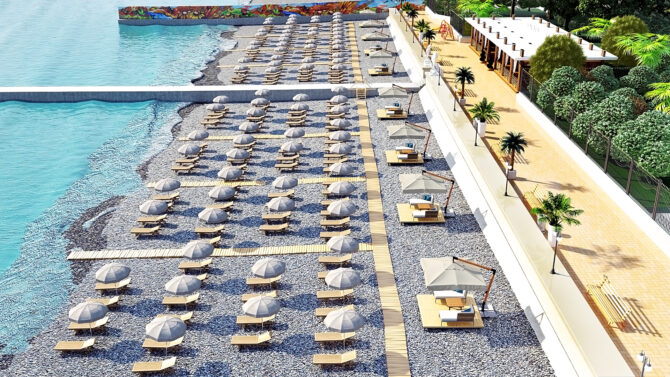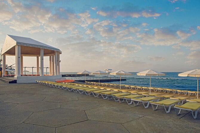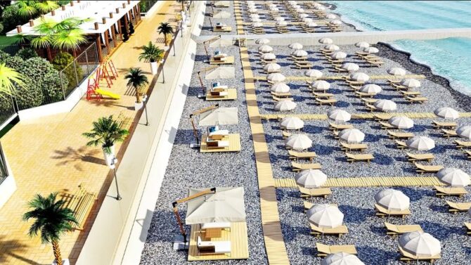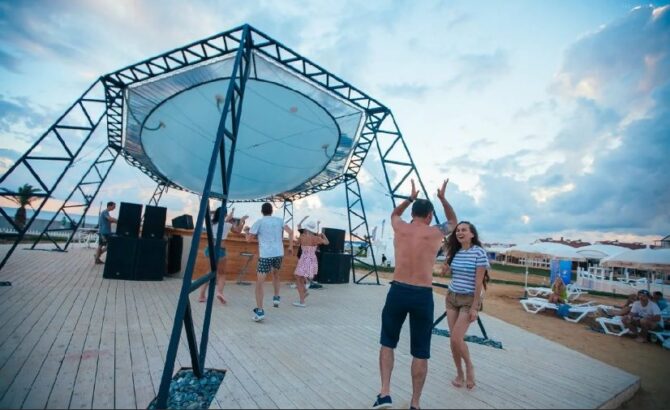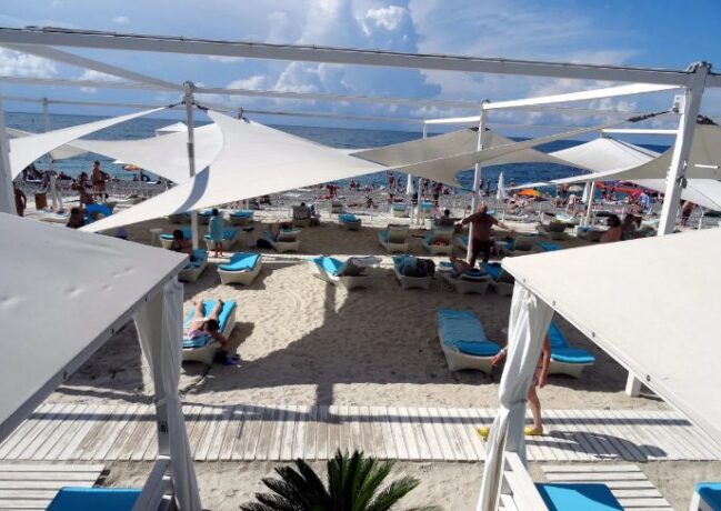 Пляж состоит из двух уровней. Нижний – это прямой выход к морю, без стационарных навесов. Можно поставить лежак у самой воды и закрыться от солнца с помощью зонта. Второй ярус – это благоустроенный участок с тентами, шезлонгами и песчаным покрытием. В стоимость аренды входит питьевая вода и фрукты. Рядом находятся яхт-клуб и пирс, от которого можно отправиться на морскую прогулку. На территории работают бары и кафе, есть кальянная, огороженная детская игровая площадка, небольшой бассейн с игрушками. Для любителей активного времяпрепровождения оборудованы площадки для пляжных волейбола и футбола. В пункте проката выдается снаряжение для водных видов спорта и забав.