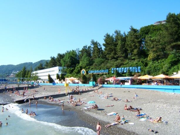 Пляж санатория «Ставрополье» пользуется спросом у курортников из-за его почти идеального песчаного покрытия, удобного подъезда и собственной набережной. На ней сосредоточена вся полезная инфраструктура. Здесь открыты точки общественного питания, продуктовые лавки, магазины товаров промышленного производства, прокат шезлонгов и других пляжных принадлежностей. На платформах установлены аэрарии. Территория открыта для свободного посещения. Летом здесь бывает сложно найти свободное место или лежак, поэтому рекомендуется приходить сюда до 10 утра.