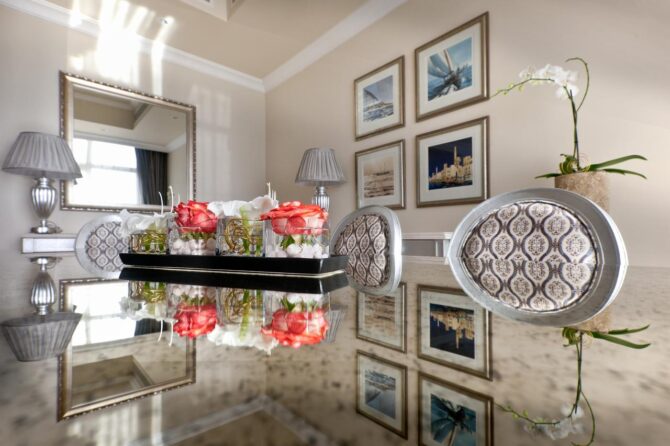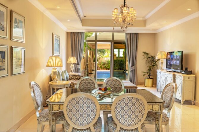 Дизайнерская линия объединения западного и восточного проходит сквозь всю организацию отеля, и кухня не является исключением. Повара, как художники, создают уникальные кулинарные творения, в которых сочетается европейская и арабская кухня. Не насладиться этим просто невозможно. Спокойная, умиротворяющая атмосфера создает идеальные условия для наслаждения и комфорта, а дизайн близлежащих территорий дополняют прекрасные цветущие сады и пейзажи природы. В отеле имеется огромный бассейн, общая площадь которого составляет 1,2 кв. км.