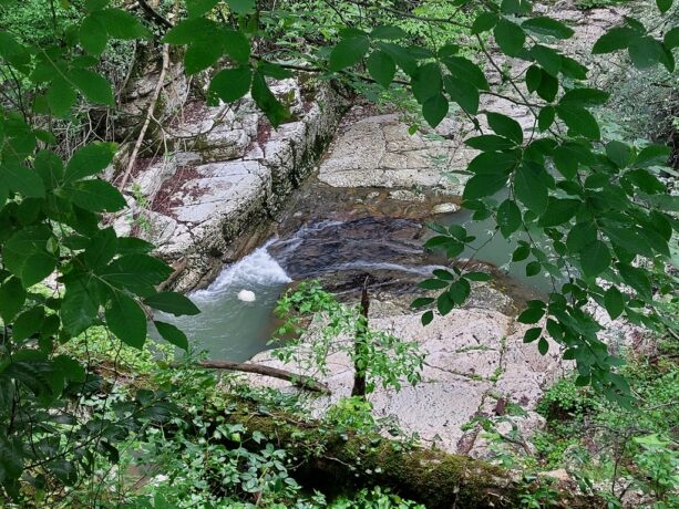 Сразу после Чертовой купели начинается крутой подъем к нижнему водопаду. В общей сложности его высота составляет 30 метров. Как уже говорилось ранее, он разделен на два каскада – 12 и 18 метров. Рядом с ним находится первая точка для привала. Она получила название Поляны дружбы. Здесь установлены лавочки, на которые можно присесть и перекусить. В высокий сезон здесь работает продуктовая лавка. В продаже – чипсы, снеки, вода, соки, соломка, кукурузные палочки, сладости.