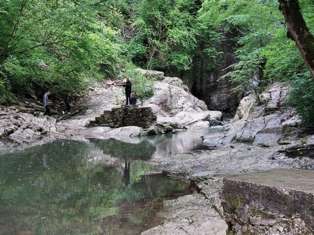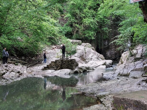 Для родителей с маленькими детьми поход к водопадам может ограничиться переходом только до Чертовой купели. Далее начинаются лестницы, подъемы в горы. С коляской здесь не пройдешь, а малыши младше 7 лет могут закапризничать. В пределах 500 метров от входа тропа более или менее удобна для передвижения с колясками. Первая достопримечательность производит приятное впечатление.