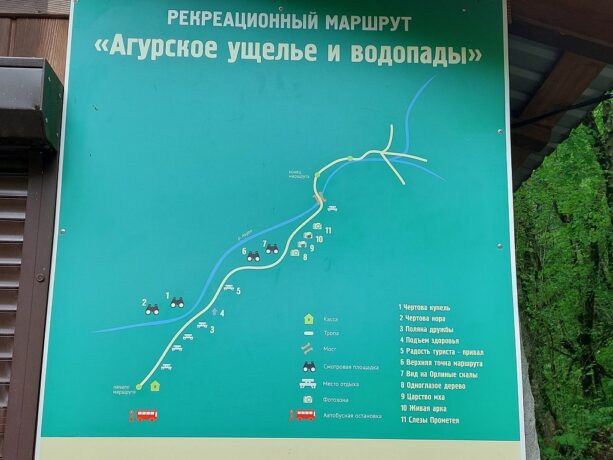 По сравнению с другими горными тропами, этот маршрут относится к категории легких. Его длина от Поляны Высоцкого до последнего водопада составляет 2,5 км. Если продолжить подниматься к Орлиным скалам, то еще около полутора километров. Путь пройдет вдоль живописного ущелья, по которому течет река Агура. На ней расположено три водопада. Нижний состоит из двух каскадов 18 и 12 метров. Средний водоскат – самый высокий – 23 м. Верхний можно назвать самым живописным. Здесь вода падает в каменный бассейн с высоты 21 с, а левую сторону тропы обрамляют Орлиные скалы.