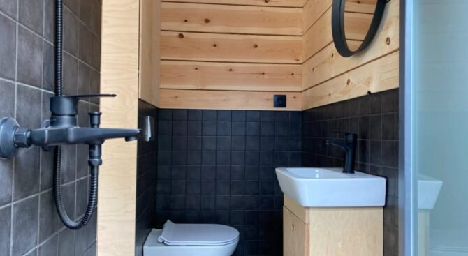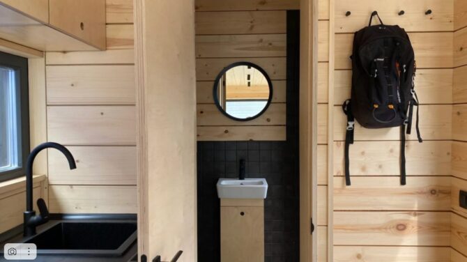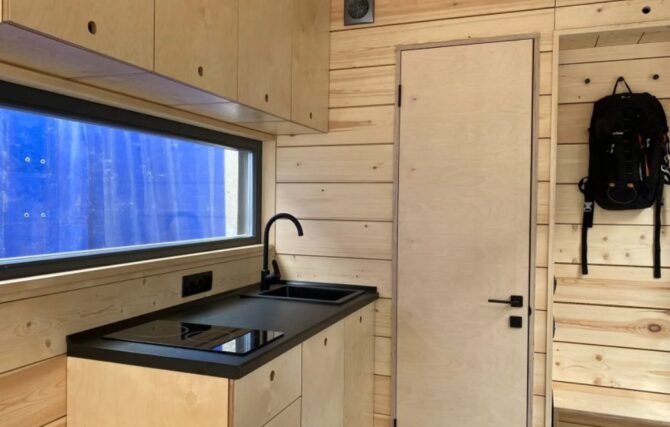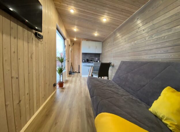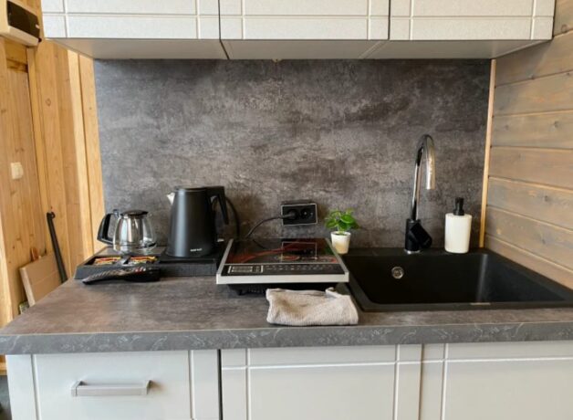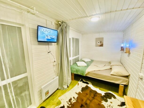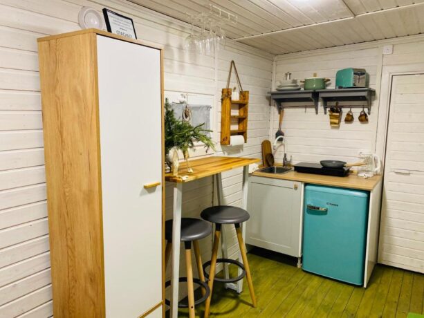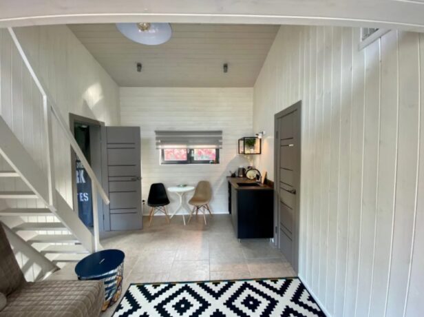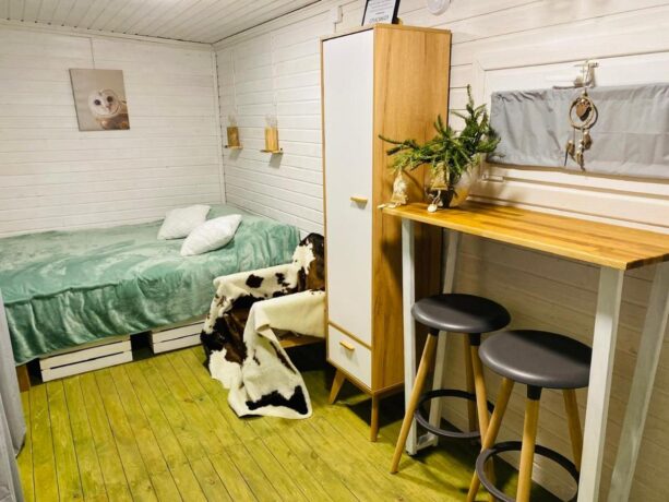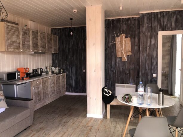 Домик в стиле ScoutKibitka – это потрясающее сочетание компактности с комфортными условиями проживания и стильным интерьером. Он полностью готов к приему гостей в количестве до 6 человек. Все вместе могут собираться в панорамной гостиной с высокими потолками. 4 спальных места находятся внизу, еще два на этаже-лофт. Можно освободить пространство, установив двуярусные кровати. В ванной комнате предусмотрены душ и туалет. Проведено отопление, водоснабжение, установлены кондиционеры и вентиляция. В мини-кухне имеется индукционная плита, мини-холодильник, посуда, чайник. Вместительный шкаф и вешалка находятся в прихожей. Хозяева дома принимают постояльцев с домашними животными.