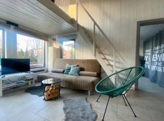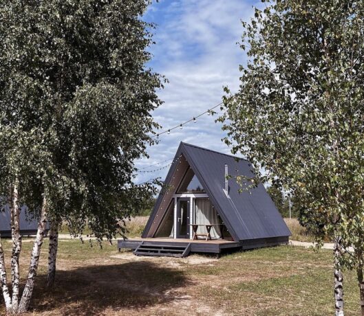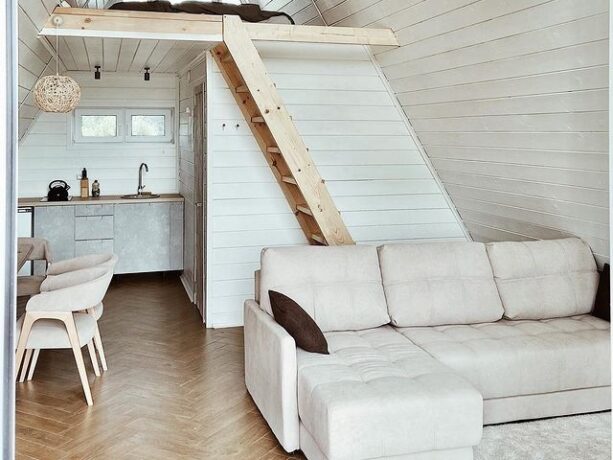 А-образные мини-дома построены в природной зоне. Комплекс называется Woody Village Riverside. Здесь гарантированы полное единение с природой, различные активности на свежем воздухе, комфортные условия для сна и отдыха. Скромные интерьеры выполнены в скандинавском стиле. основная спальня находится на втором ярусе, к которому ведет деревянная лестница без поручней. Дополнительные два спальных места предусмотрены на раскладном диване внизу. На кухне имеются: плита, холодильник, чайник, сковородки, кастрюли, сет столовой посуды. На улице оборудована мангальная зона.
