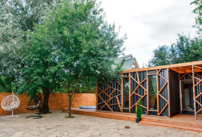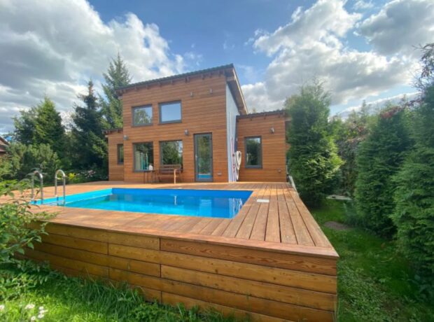 Уютный комфортабельный дом находится на территории еще одного московского парка – Мещерского. Он занимает небольшой, но очень зеленый участок, со всех сторон окруженный деревьями. Его преимущество над другими мини-домами состоит в наличии летнего открытого бассейна. Чаша встроена в террасу, поэтому выходя из дверей, гости попадают в лаундж-зону с шезлонгами, садовой мебелью и плавательным бассейном. Внутреннее помещение разбито на два этажа. На первом находится гостиная с кухней и обеденным столом, санузел и сауна. На втором – спальня с двухместной кроватью. На свежем воздухе оборудована летняя кухня с мангалом, жаровней, казаном. Недалеко от дома находится Мещерский пруд. К нему ведут тропинки через парк. Пляж на берегу является одной из самых популярных площадок отдыха для москвичей. Территория благоустроена и регулярно очищается от мусора.
