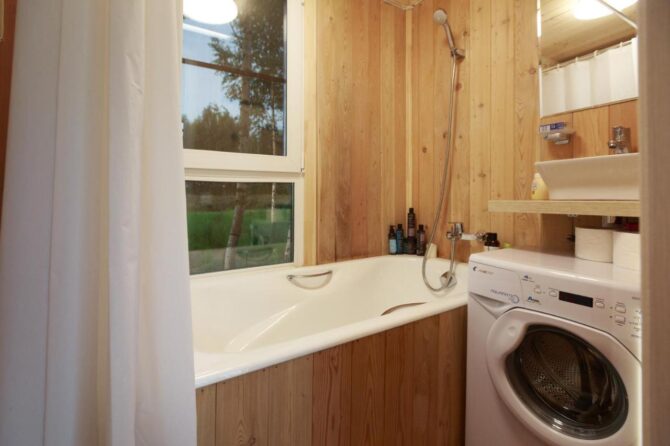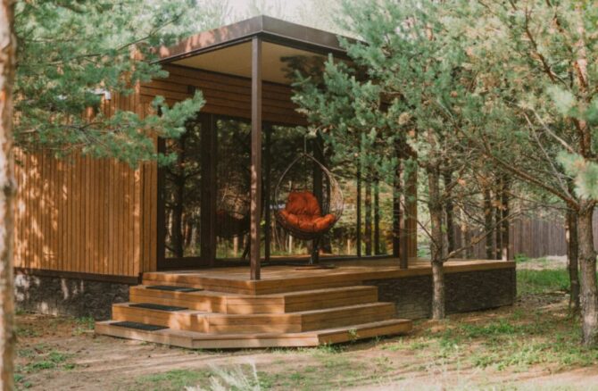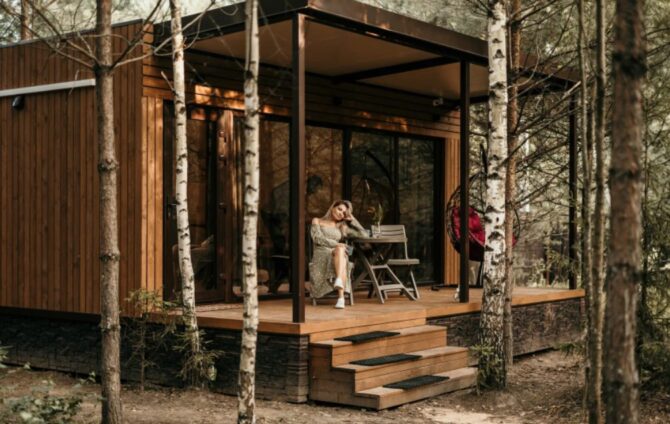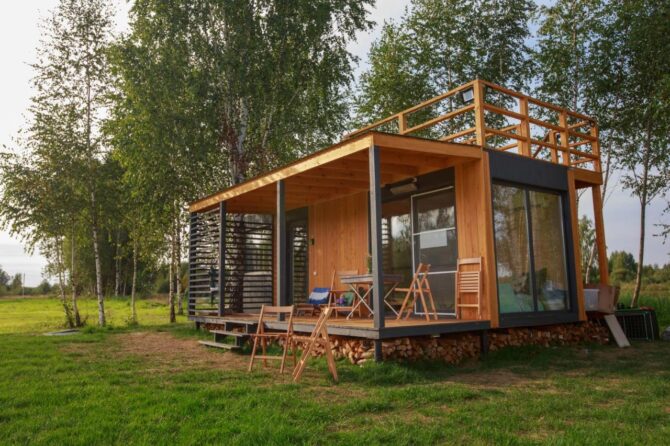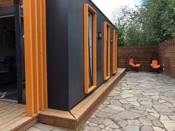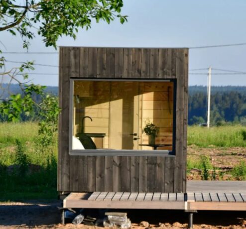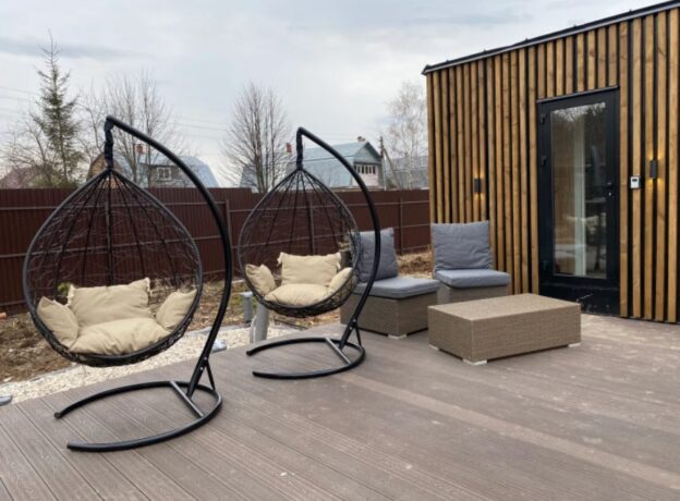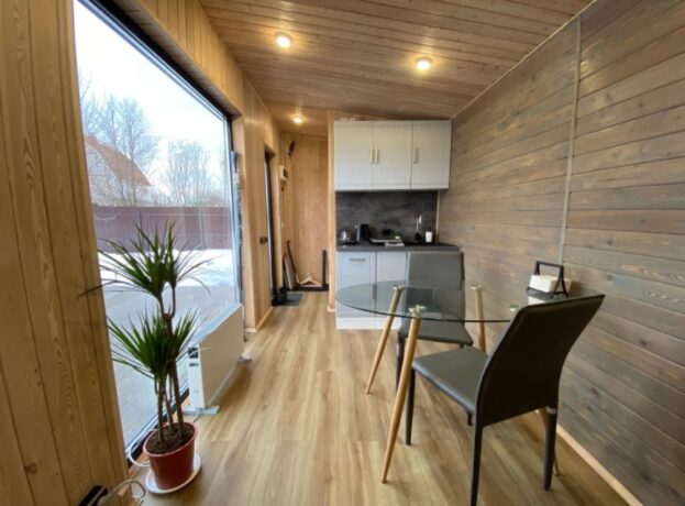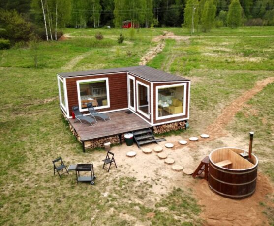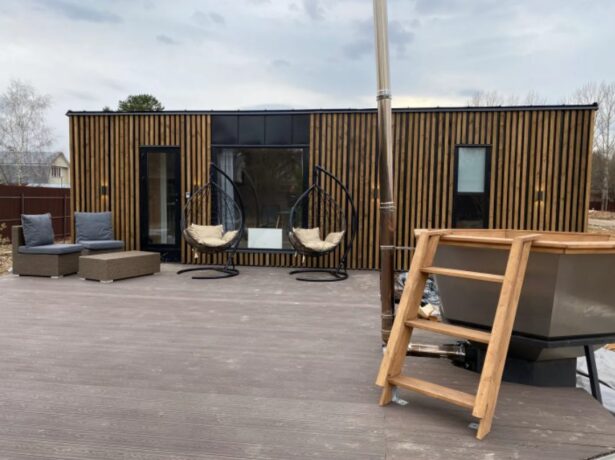 Поселок бизнес-класса Гринвуд является одним из самых популярных мест отдыха в выходные дни. Здесь сдаются в аренду необычные дома, в том числе и малогабаритные. Современный мини-дом с панорамными окнами полностью отвечает потребностям человека в комфортных условиях проживания, а гостеприимные хозяева позаботились о том, чтобы постояльцам было чем заняться. На участке построена просторная терраса с чаном Фурако, кострищем для приготовления еды на открытом огне и парковкой. Для активного досуга доступна вся поселковая инфраструктура: детские и спортивные площадки, конный клуб, скалодром, теннисный корт, пляжи на двух озерах, горнолыжный спуск и горка для катания на ватрушках.
