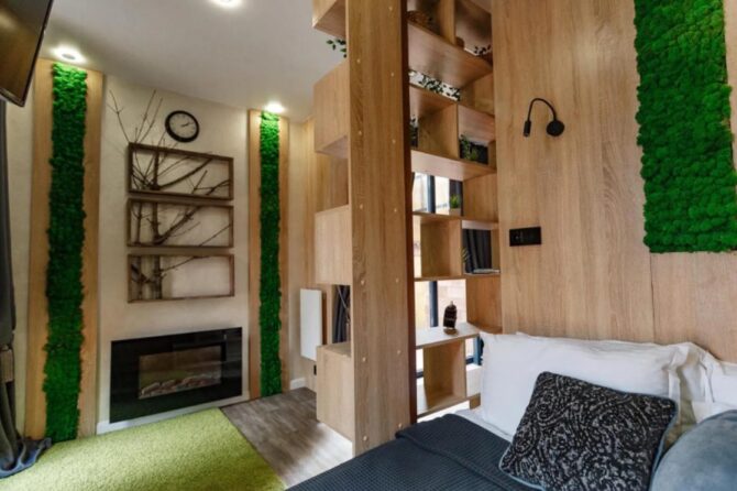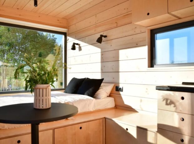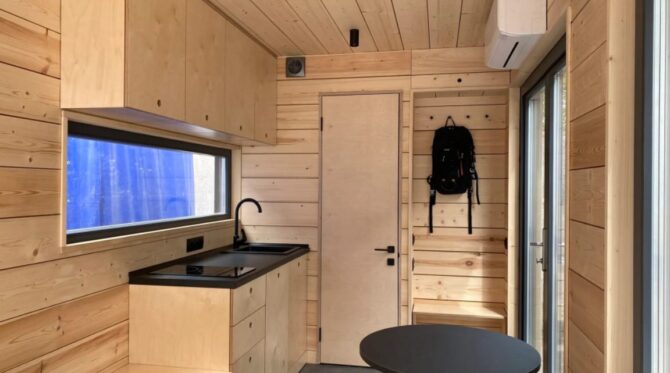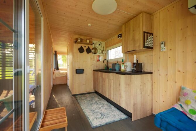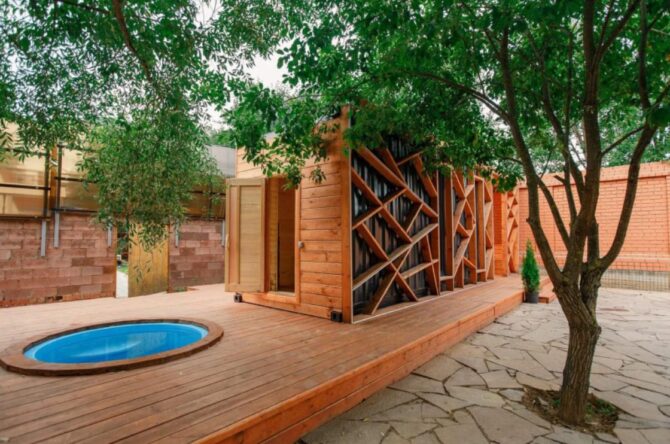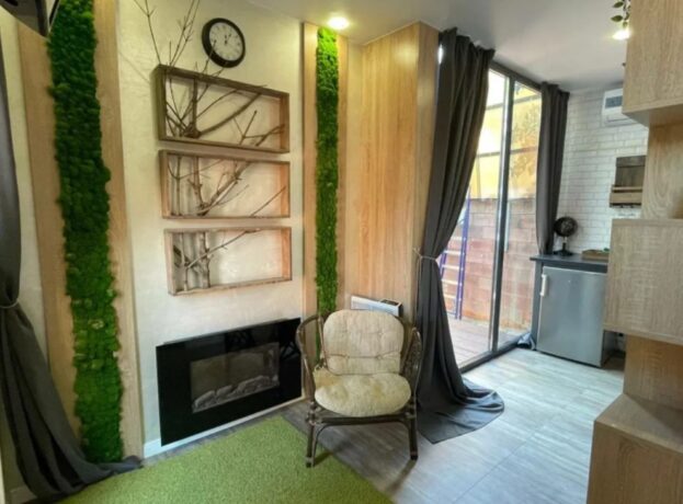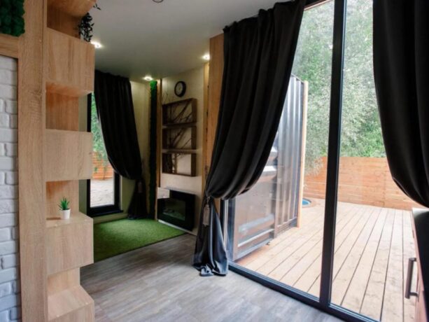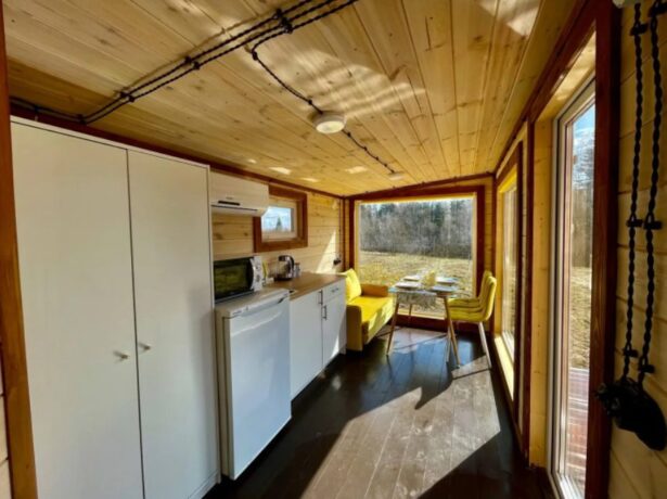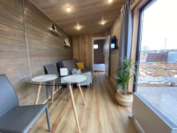 Сразу за входными дверями находится гостиная с кухней и обеденной зоной. Напротив большого телевизора установлен мягкий диван. На нем могут разместиться два дополнительных гостя. Спальня находится в отдельном помещении. Рядом находится санузел с душевой кабиной и водонагревателем. В отделке помещений использованы натуральное дерево, камень и металл. На террасу дома летом выставляются мягкие шезлонги и кресла-коконы. В них удобно отдыхать с чашечкой ароматного травяного чая в руках после парения в чане.