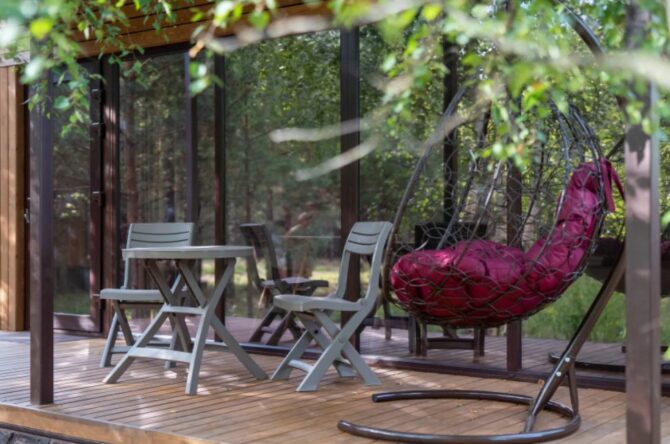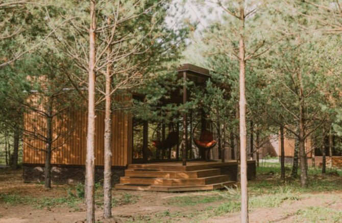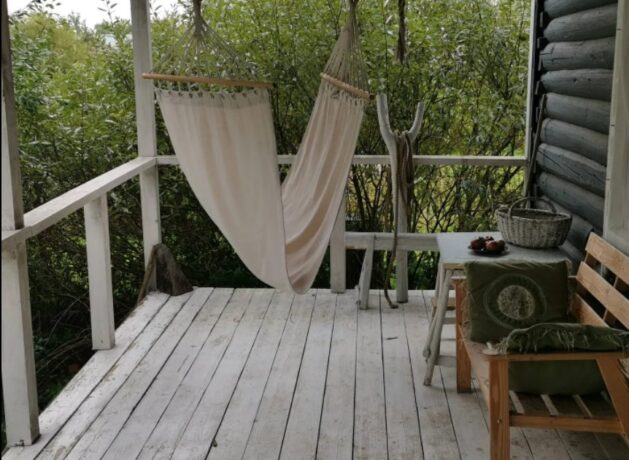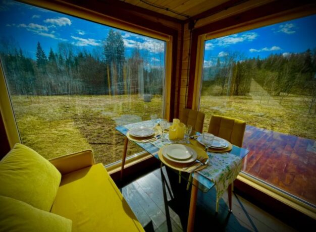 Деревянные бунгало для двоих расположены в сосновом лесу. При входе гостей встречает просторная терраса с подвесным креслом-коконом и удобным гарнитуром из садовой мебели. В гостиной с панорамными окнами находятся кухонный уголок и обеденный стол. Приятное впечатление создает интерьер в скандинавском стиле, тщательно подобранный декор и посуда. В совмещенном с душевой кабиной санузле установлен водонагреватель. Заботливые хозяева подготовили для постояльцев халаты и наборы из трех полотенец. Участок находится недалеко от берега реки. Здесь можно подарить шашлыки, взять напрокат лодку, велосипед, развести костер на специально отведенном месте, порыбачить, а затем приготовить уху в походном котелке. В комплексе действует доставка готовой еды из ресторана. Блюда готовятся из фермерских продуктов. Владельцы не принимают гостей с домашними питомцами.