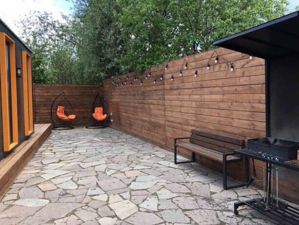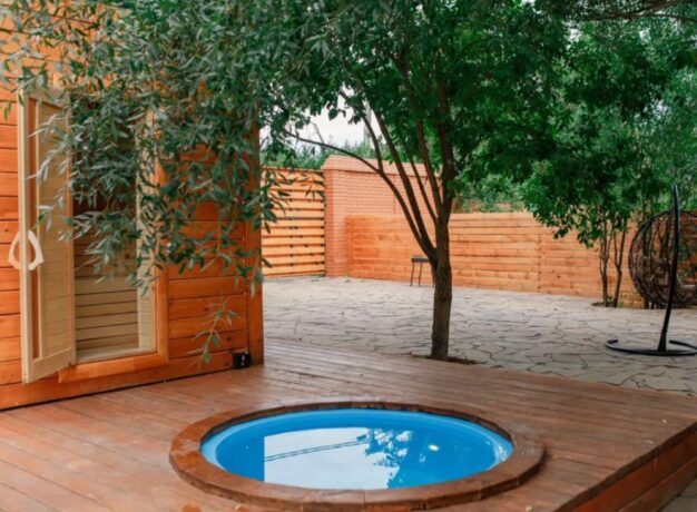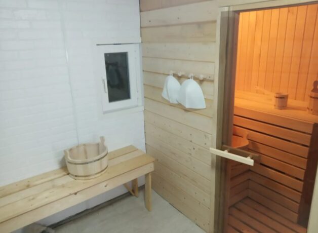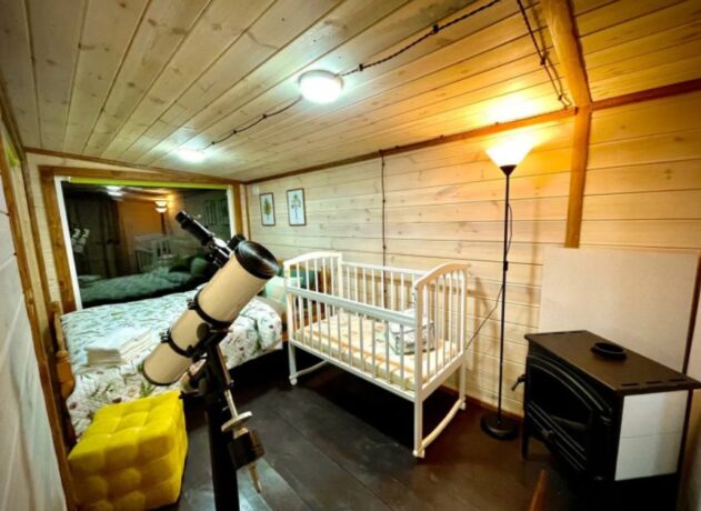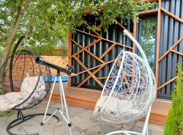 Особый интерес представляет уличная терраса. На ней установлены кресла-коконы, телескоп, небольшая купель. Во дворе отдельно оборудована кальянная с мангалом и беседкой. В доме есть современная сауна, построенная с применением гималайской соли и яшмы. В зимний период купель на террасе можно разогреть. Летом гости предпочитают окунаться в холодную воду. До ближайших магазинов и аптеки можно доехать за пару минут. Автобусная остановка находится рядом с домом.