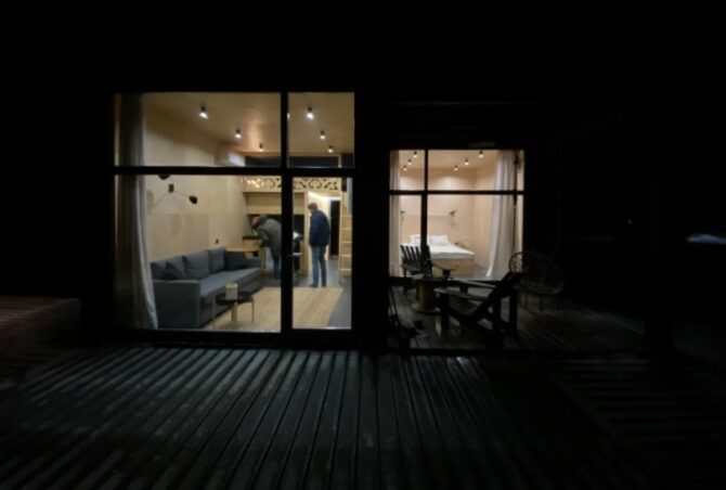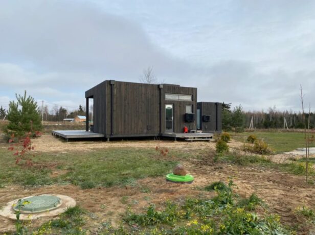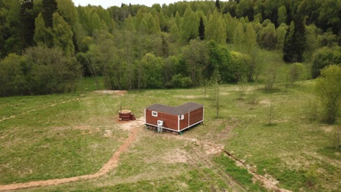 Мини-дом для семейного отдыха расположен у истока Москва-реки в полутора километрах от заказника Старовозрастные ельники. Площадь участка составляет 24 сотки. Нет никаких заборов и ограничений. Можно гулять там, где пожелается. Дом разделен на три функциональные зоны: спальню, кухню-гостиную и санузел. Рядом с двуспальной кроватью есть место для детской кроватки. На кухне имеются все принадлежности для приготовления и хранения еды. Панорамные окна с видом на лес и поле установлены в каждой из комнат. Санузел совмещен с ванной. Вода нагревается с помощью бойлера.