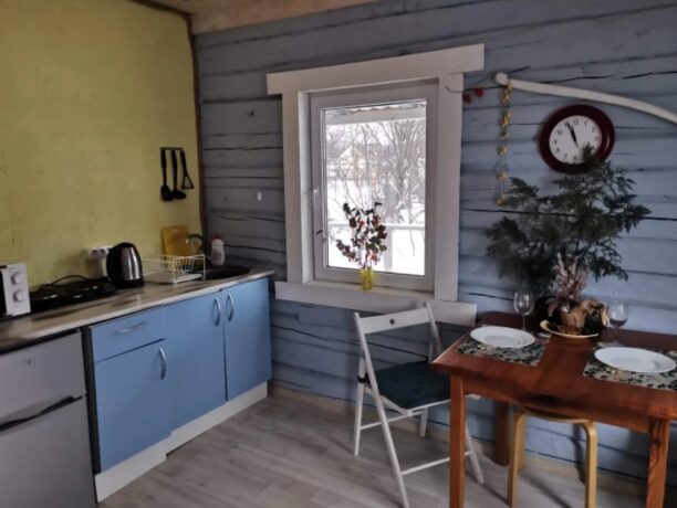 На окраине города Юрьев-Польский находится закрытая коттеджная зона. Здесь для уединенного отдыха предлагается одноэтажный мини-домик на двоих. По соседству расположены фермерское хозяйство, плодовый сад и местная достопримечательность – вековой финно-угорский дом. Местечко очень уютное и предназначено для двух взрослых людей. К их услугам: кухня с современной бытовой техникой, санузел с душем, просторная кровать, барная стойка со стульями. На террасе установлены деревянные складные кресла, под Новый год заботливые хозяева наряжают елку и предоставляют санки для катания с горок.