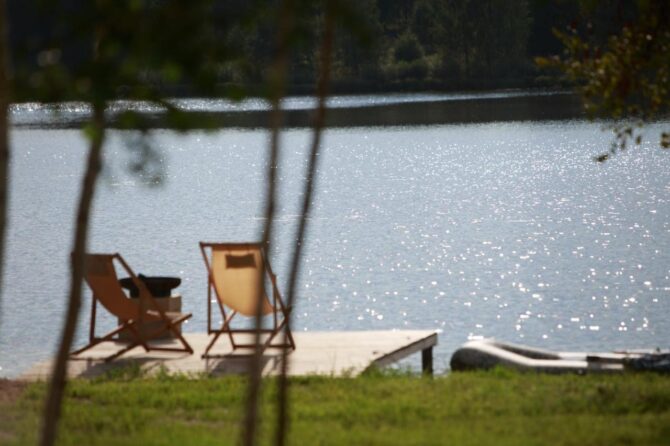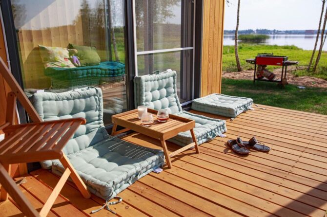 Мини-дом построен на берегу Круглого озера. Отдых у воды является основным времяпрепровождением в летний период. Пляжная зона благоустроена по высшему разряду. Здесь много места, удобный подход к воде, отличная инфраструктура. На территории имеются площадки для пляжного волейбола и футбола, водные аттракционы, детские игровые зоны в лесу. В пункте проката выдаются лодки, сапборды, спортивный инвентарь. Работает магазин, в котором можно купить средства от комаров, пляжную обувь, детские игрушки, уголь и розжиг для мангала.