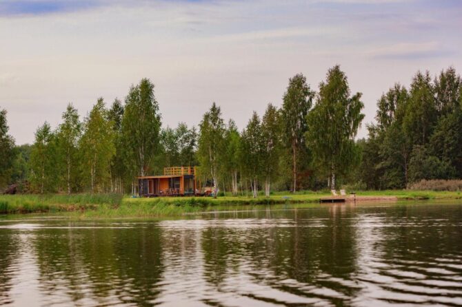В Новой Москве сдается ультрасовременный домик, построенный на берегу озера. В нем предусмотрены условия для отдыха двух человек. Территория полностью закрыта от посторонних глаз. Интерьер создан в эко стиле по европейским стандартам. Комфорт, уют и практичность присутствуют в каждой детали. В малогабаритном помещении нашлось место для просторной кровати, камина, кухонной и обеденной зон, полок для вещей и книг, отдельного санузла с душевой кабиной.