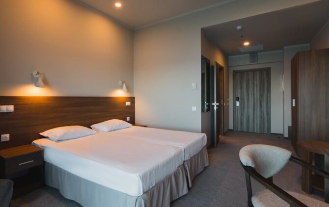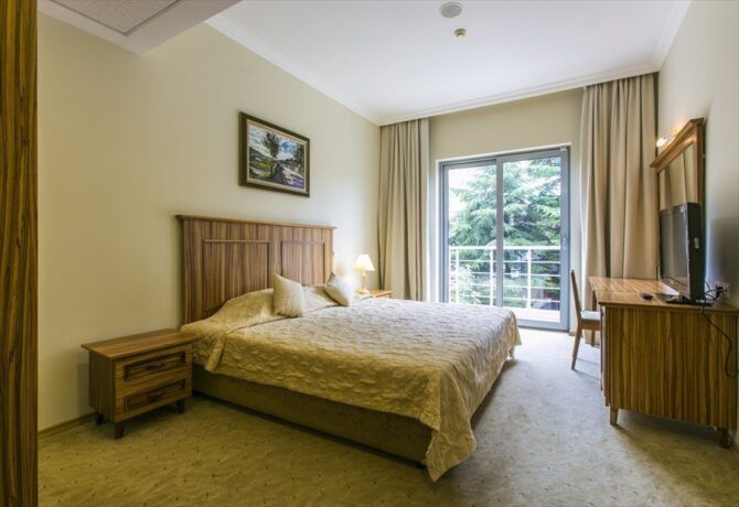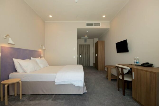 - Эконом (20 кв. м) без балкона. Прекрасно подойдет курортникам, мечтающим отдохнуть на море по демократичным ценам. В номере могут разместиться от 2 до 4 человек. Это могут быть двое взрослых людей или родители с одним или двумя детьми. Стационарно установлена двуспальная кровать. Два места добавят по запросу. Это могут быть односпальные кровати или раскладные кресла.