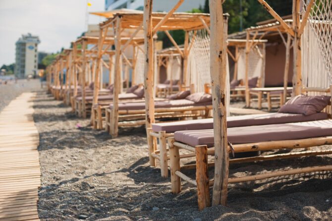 Стоит гостям выйти за ворота и проделать всего 50 шагов, как они попадают на один из поселковых пляжей. Постояльцы «Sky and Mare» могут бесплатно пользоваться услугами 4-х пляжных зон санатория «Славутич». Пляжные полотенца выдаются в отеле. Навесы, шезлонги, зонтики уже находятся на берегу. В инфраструктуру входят – туалеты, душевые, кабинки для переодевания, кафе, услуги организаторов пляжных игр. Все, кроме еды и развлечений, предоставляется бесплатно.