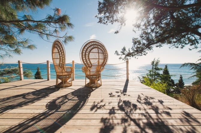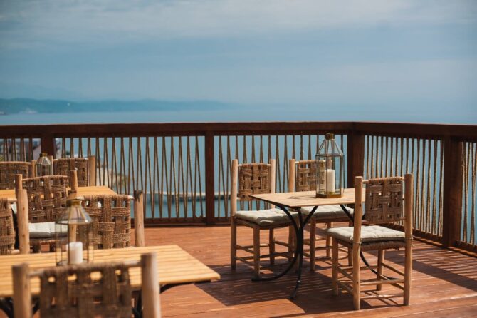 - Полулюксы (35-43 кв. м) представлены однокомнатными и двухкомнатными номерами. Балкон площадью 9 кв. м больше напоминает террасу. На нем установлены шезлонги для принятия солнечных ванн, столик и полукресла для завтрака или чаепития. Интерьер выполнен с учетом эко-стандартов. Минимум декора, много дерева, качественная обивка для мебели и добротный текстиль на окнах.