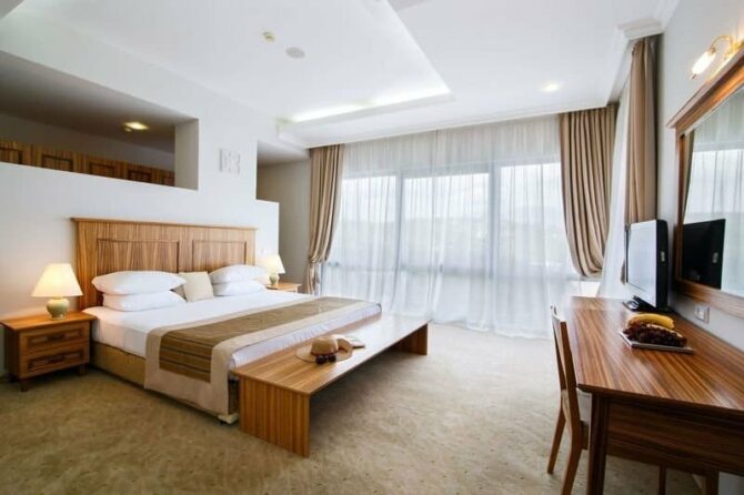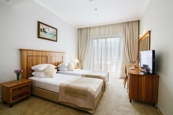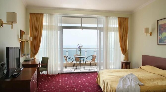 - Люкс+ (55 кв. м) – двухкомнатный номер с балконом и видом на море. Возможно размещение до 5-ти человек. В комнате с панорамным остеклением установлена круглая двуспальная кровать формата Кинг-сайз, в другой – 2 односпальные. Имеется раскладное кресло. Панорамные окна зашторены портьерами «блэк-аут», которые создают особый уют и затемнение для полноценного сна. Эта категория номеров пользуется спросом у больших семей и молодоженов, решивших провести медовый месяц на море.