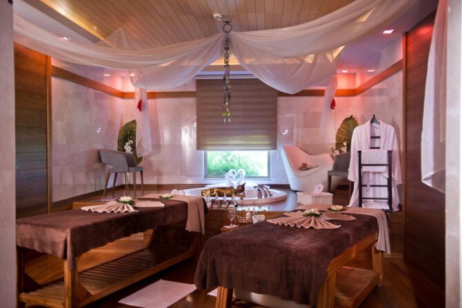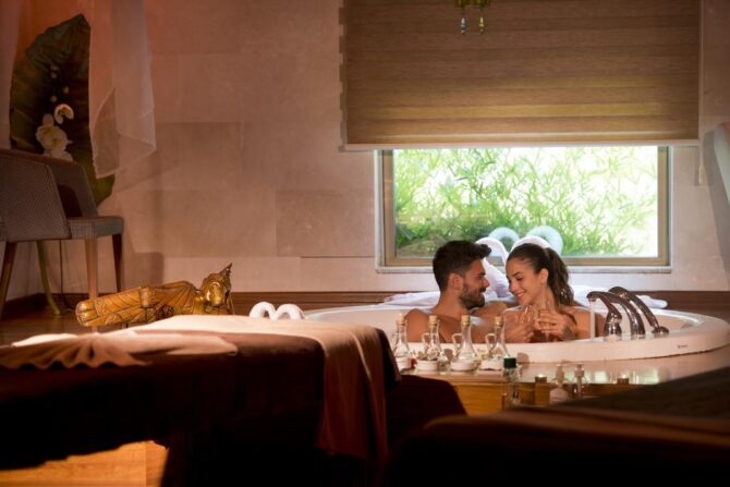 Особенная программа ожидает молодоженов. Их встречают при заезде с праздничными коктейлями и специальным брелоком в виде сердца. В украшенном лепестками роз номере вы найдете вино, фрукты, цветы, халат и тапочки. В первый день пребывания вам также принесут сладости, орешки и другие угощения. Вы можете воспользоваться бесплатным пилингом (15 минут) в СПА, а также скидкой в 50% на услуги парикмахера. Если есть свободные места, можно заказать один раз завтрак в номер, а также ужин в ресторане а-ля карт.