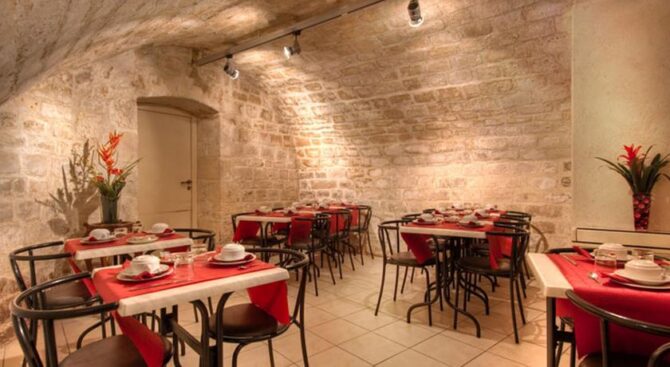 Завтраки гостям предлагают в аутентичном зале с каменными стенами, которое когда-то давно служило винным погребом. На первом этаже Hotel Cujas Pantheon находится большой зал с мягкими диванами, где можно провести время за чашечкой кофе или, заказав бокал хорошего вина.