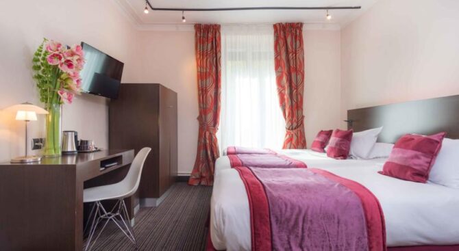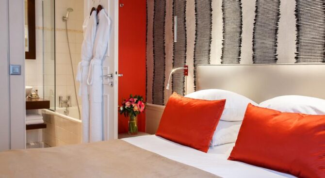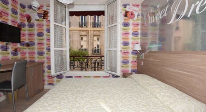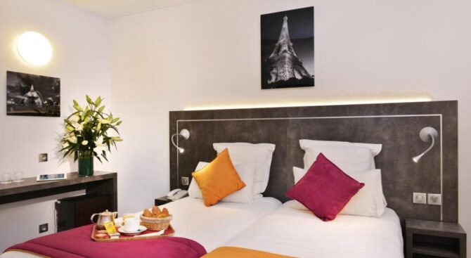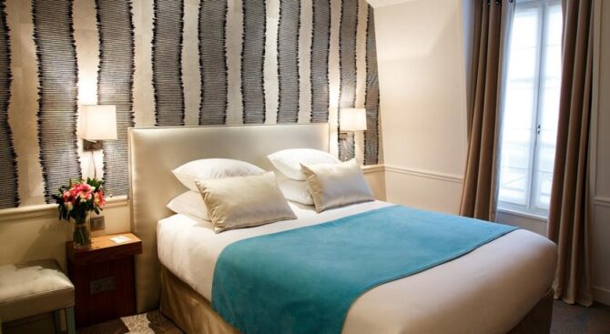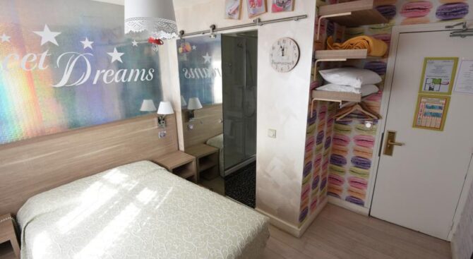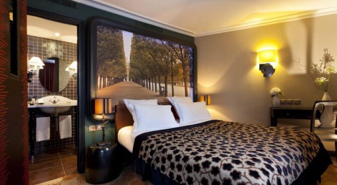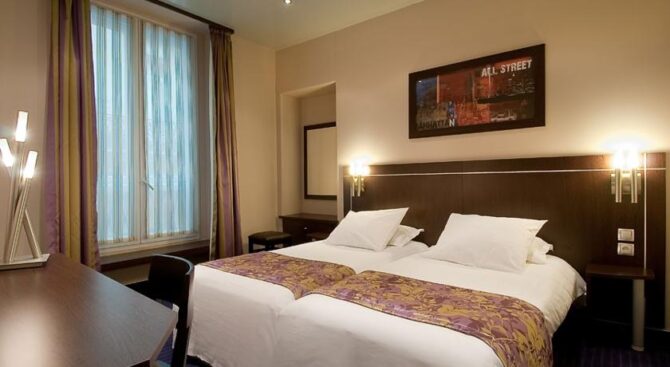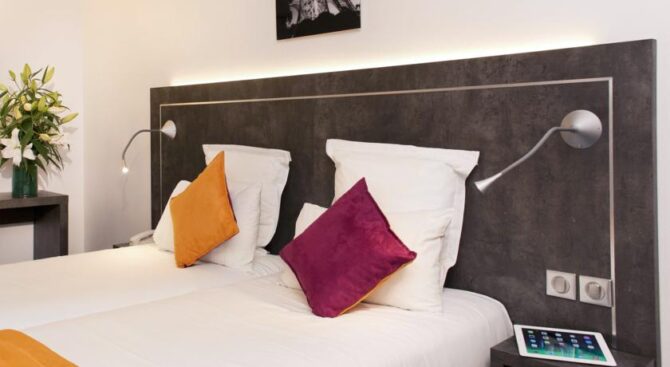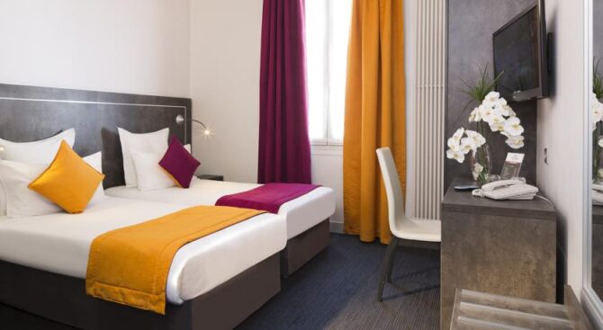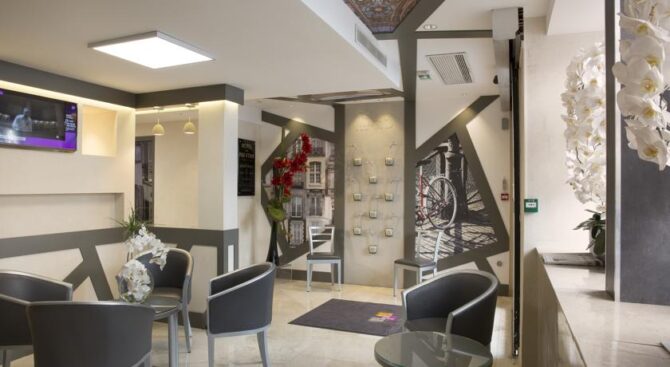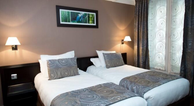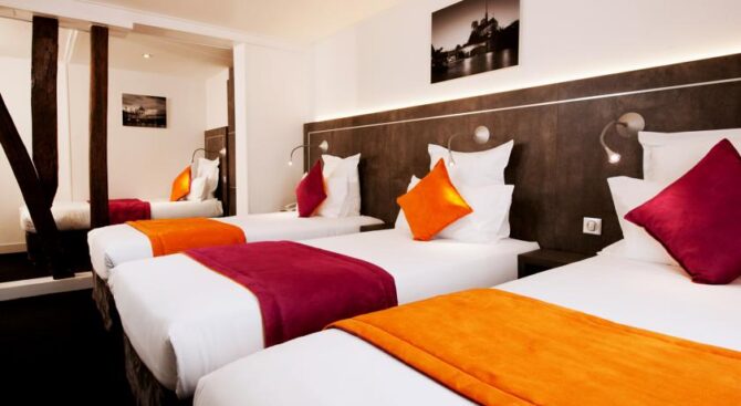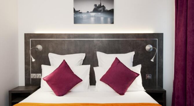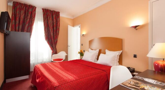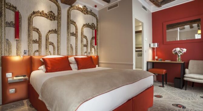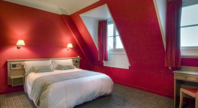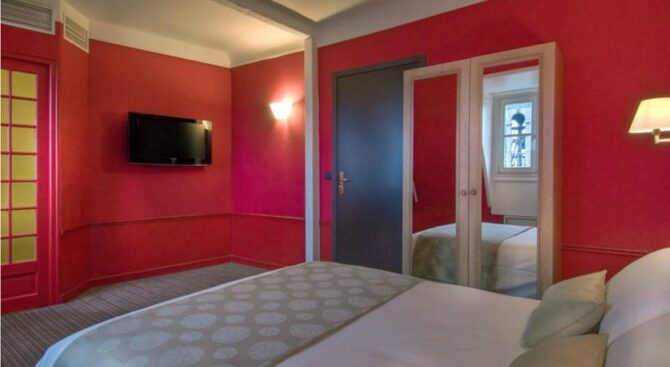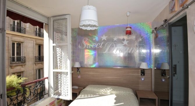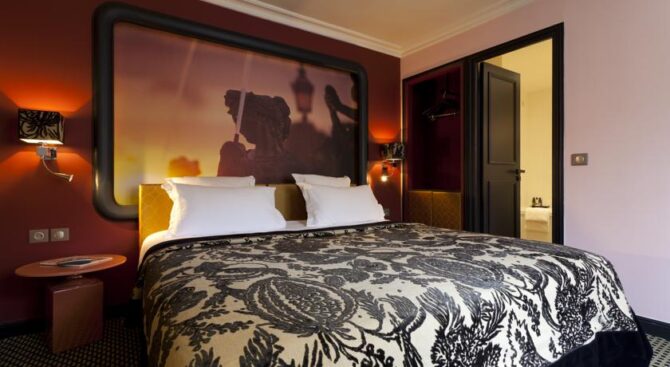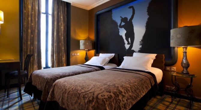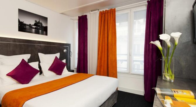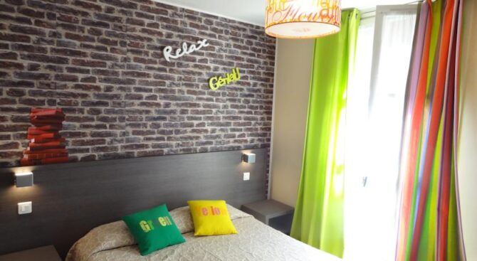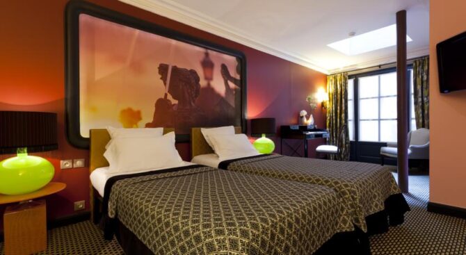 Этот недорогой отель в центре Парижа обладает неповторимым шармом. Все номера в здании оформлены уникально, ярко и необычно. Небольшие комнаты имеют традиционные «французские» балкончики и большие окна, из которых можно наблюдать за жизнью улицы. Неординарное оформление и авторский дизайн в интерьерах комнат позволяют чувствовать себя по-особенному.