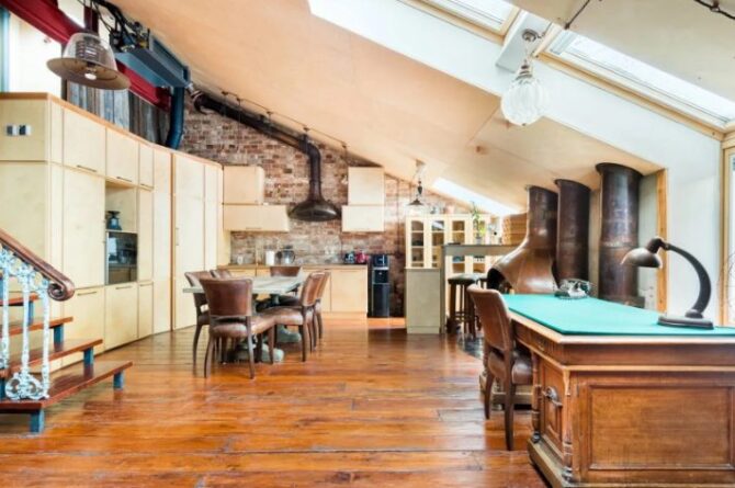 В этой современной мансардной квартире находится 3 спальни, зона отдыха с необычным круглым окном, на котором можно сидеть, гостиная, две ванных комнаты, кухня-столовая, офис и другие комнаты. Большие окна пропускают много света в интерьер и делают пребывание в апартаментах очень приятным. На кухне установлены новые электроприборы, которыми можно очень легко пользоваться без обширных знаний по эксплуатации. В ванных комнатах есть душевые кабинки.
