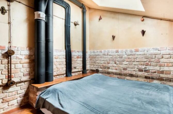 Эти апартаменты имеют деревянные полы, множество труб, в качестве декора и, что самое главное, наклоненный потолок с панорамными окнами. На первом этаже квартиры находится столовая, кухня, первая спальня и офис не огражденные стенами. На кухне есть все необходимое для готовки: будет доступ к современным бытовым приборам, включая электроплиту, духовку, посудомоечную машину, холодильник, кофемашину и кулер с водой. Также в самой квартире есть: