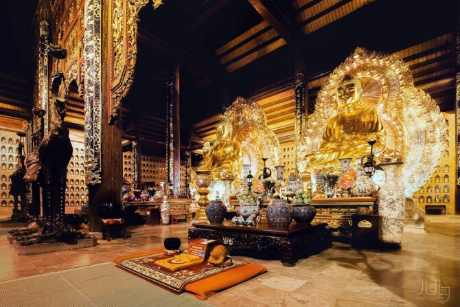 Крупнейший в стране храмовый комплекс Бай Динь находится в 18 км от административного центра провинции Ниньбинь. Это место паломничества буддистов со всей страны. На территории площадью 100 га расположены самые большие во Вьетнаме пагода, колокол и статуя Будды. Заезд производится не через каменные храмовые ворота (они закрыты), а через современный пропускной пункт. Сразу за ним находится парковка, причем просят оставлять не только моторизированные средства передвижения, но и велосипеды с самокатами.
