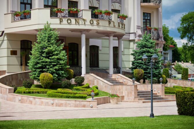 Отель «Понтос Плаза» расположен в самом сердце Ессентуков. Вблизи находится старинный парк, природные минеральные источники и популярная грязевая лечебница. Отель выполнен в современном стиле модерн. Здание имеет роскошную архитектуру и презентабельную конструкцию. Лечебный объект рассчитан на 18 номеров с различными условиями, которые соответствуют европейским стандартам. Каждый номер имеет изысканное оформление. В отеле проводится лечение различных видов заболеваний. В ресторанах повара готовят изысканные европейские и кавказские блюда. Туры в лечебное учреждение проводятся ежегодно.
