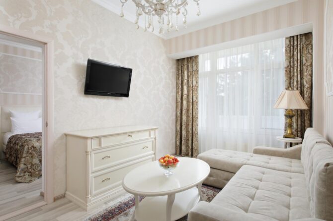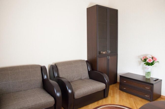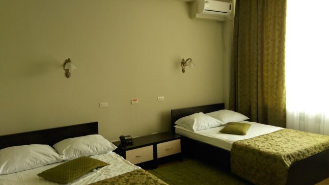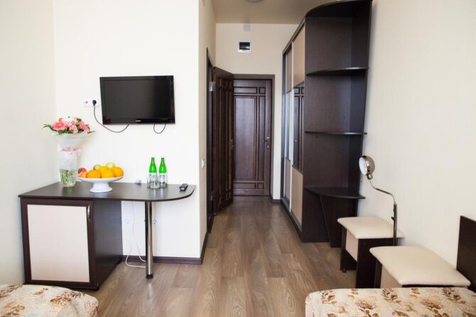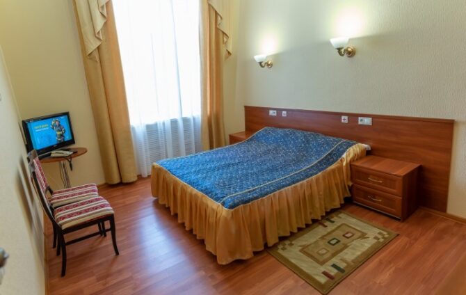 Комфортабельный отдых в просторном светлом номере позволит ощутить спокойствие в приятной атмосфере. Все номера оборудованы современной мебелью. При приобретении путёвки предоставляется полноценное питание и медицинские процедуры. Цены на проживание являются оптимальными для каждого посетителя. Пансионат рассчитан на 55 мест. Дети могут расположиться в комплексе бесплатно. В стоимость включено посещение кафе и ресторанов.