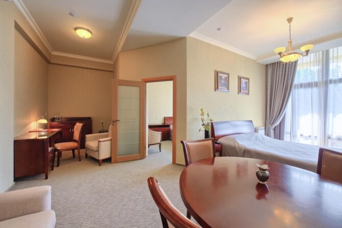 Гостиничный комплекс соответствует всем требованиям лечебных учреждений. Отдыхающие могут разместиться в любом номере. В каждом номере присутствует телевизор, мягкая мебель и все необходимые предметы интерьера. Уборка выполняется каждый день. Каждую неделю меняют постельное бельё и полотенце. Туристов обеспечивают диетическим 3-х разовым питанием. Цены номеров соответствуют комфортабельным условиям гостиницы. Детям разрешается посещать санаторий с 4 лет. Туры можно забронировать в любом городе.