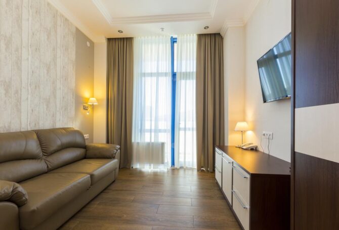 Сан Палас Гагра – четырехзвездочный отель, который не оставит равнодушными даже придирчивых туристов. Есть два корпуса – один на 6 этажей, второй отстроен не так давно, и в нем всего 3 этажа. Проживание в номерах от 2700 рублей за сутки на взрослого без питания. Деи до 6 лет проживают бесплатно. Если докупать завтраки, обеды, ужины в отеле, один прием пищи обойдется в 300 рублей на человека.