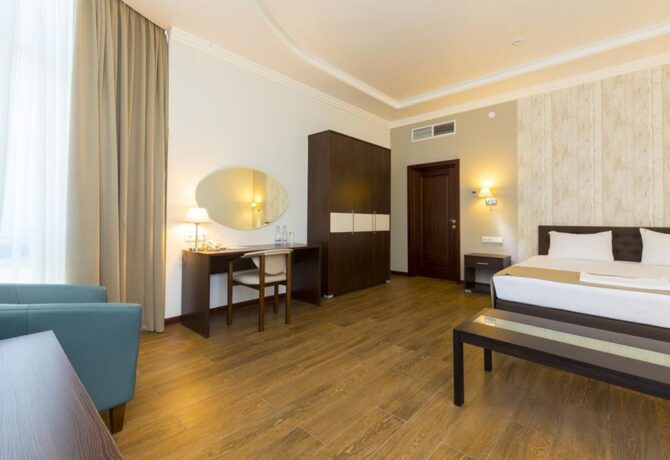 Номера богатые – в основном двухкомнатные люксы. В одной комнате находится кровать, рабочий стол, плазма, холодильник, платяной шкаф и сейф. В другой – кожаный раскладной диван, рабочий стол, шкаф и холодильник. В таком номере запросто уместятся две семьи. Ванная тоже просторная, есть мыло, гель для купания, шампунь и даже шапочка для душа. На каждого полагается по 3 белых полотенца, которые меняют каждый день.
