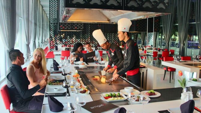 - Arrigato – японская кухня. Шеф-повара готовят в открытую, гарантируя гостям невероятное шоу с приготовлением продуктов, выбранных вами.