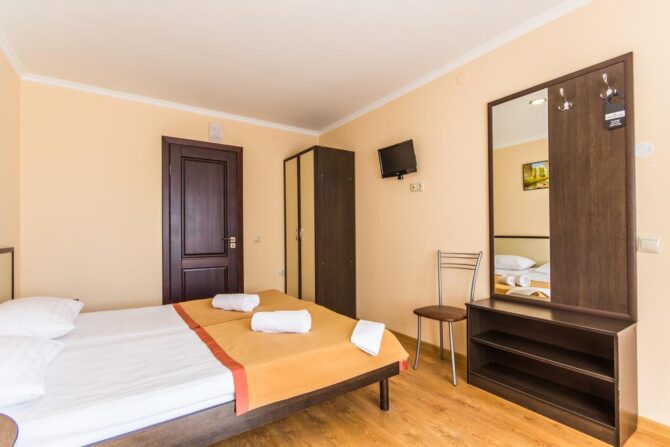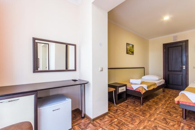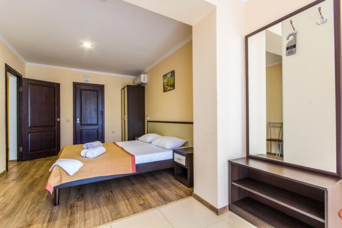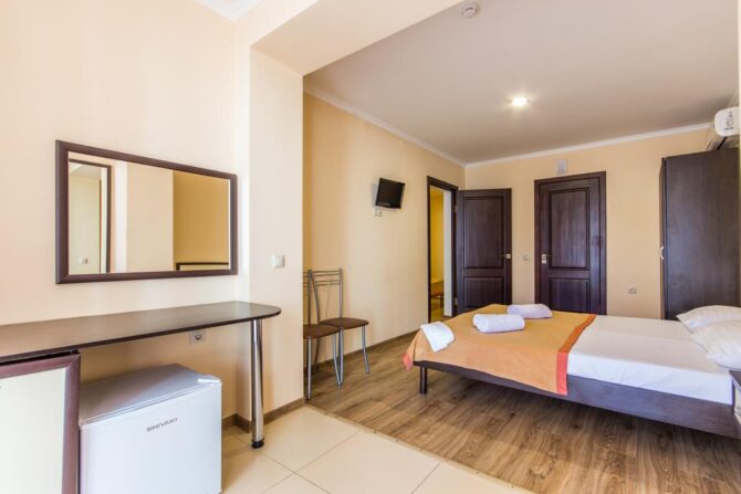 Семейные номера больше стандартов по размеру, двухкомнатные, есть возможность установки кровати для ребенка. Во всех комнатах, независимо от типа, стоит чайный уголок, телевизор, холодильник, современная климатическая техника. Ванная комната просторная, совмещена с санузлом. Комнатные и пляжные полотенца меняются по запросу.