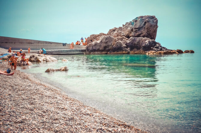 - Детский: самый известный и удобный пляж в городской черте, облагороженный, со сложным рельефом от камней и бетонных плит до песка и мелкой гальки. Очень оживленное место.